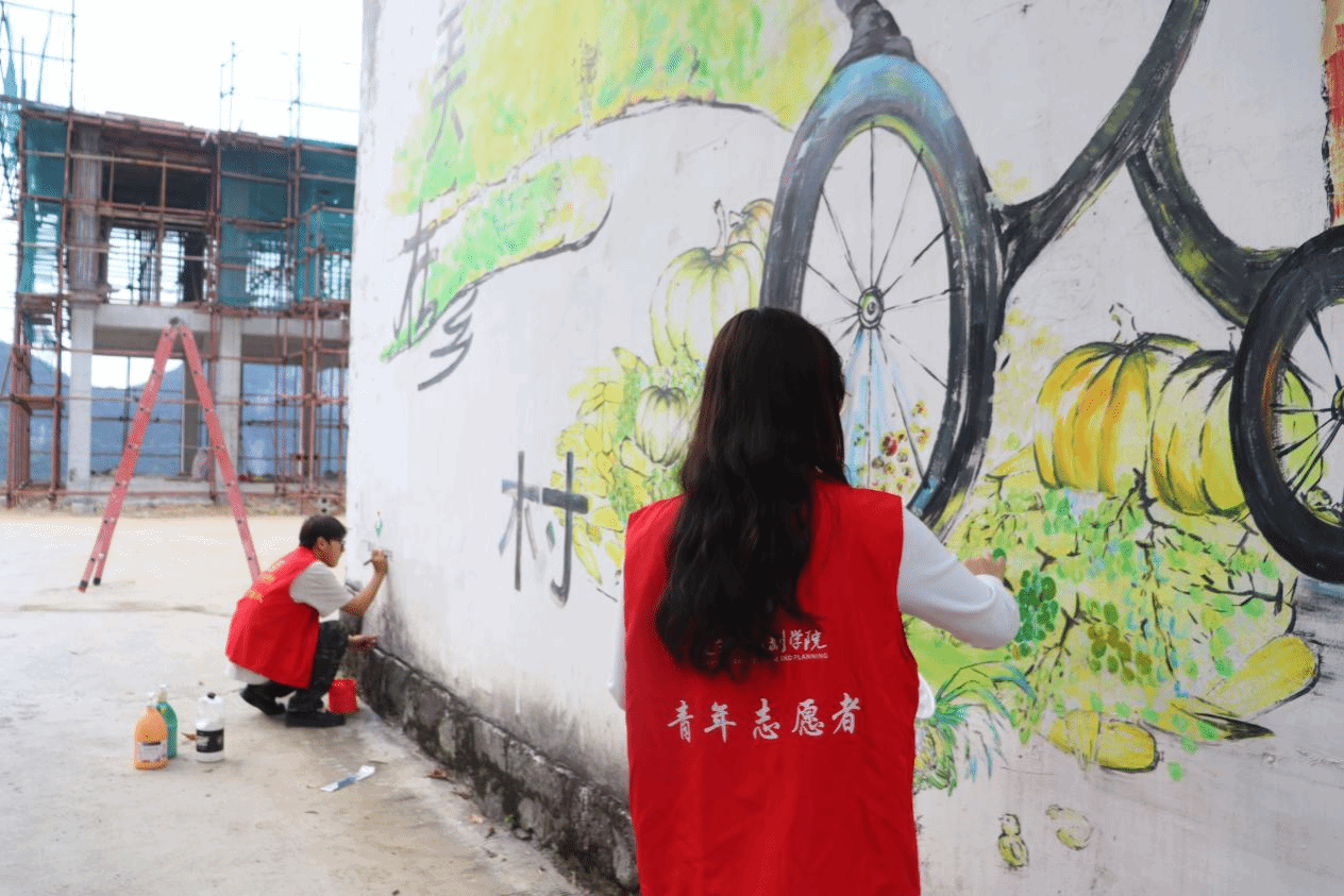 向美而行,绘就乡村美丽画卷。该院“绘美乡村·传承添彩”是学校优秀实践品牌项目。2020年、2021年暑期“三下乡”期间,该院师生在河池都安龙湾乡群乐村村部绘制了《乡村振兴战略》《美在乡村》两面墙绘。本次活动期间,该院师生勘察了这两幅墙绘的主体情况并确定修缮方案,对掉色严重的墙面进行初步清理,根据实际情况调配颜色进行补色。为持续打造“绘美乡村”主题墙绘,师生们还赴澄江镇自成村测量适合进行墙绘的墙体尺寸,为下一步志愿服务活动提前谋划。