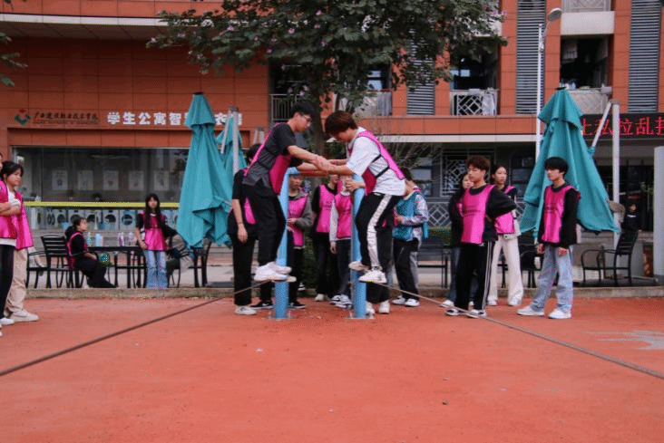 接着,同学们分成若干小组,进行了“传递呼啦圈”“众志成城”“同心鼓”“信任背摔”“高空断桥”“齐心协力”“活力飞盘”等一系列团辅游戏。这些游戏既考验了同学们的团队协作能力和心理素质,又让他们在挑战中收获了成长和自信。在游戏中,同学们互相支持、鼓励,共同面对挑战,深刻体会到了团队协作的力量和信任的重要性。