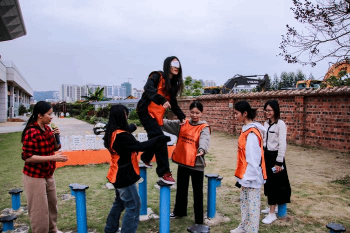 学生进行梅花桩团辅游戏