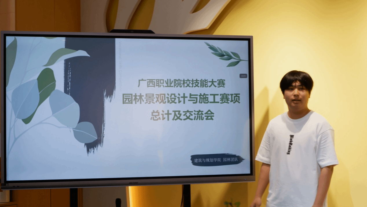在第9期活动中,袁朋同学代表高职组园林景观设计与施工赛项参赛团队作分享。他从赛项基本概况、赛前备战准备、参赛整体情况、赛后复盘总结等方面进行了阐述。团队成员郁文宇、钟达海、覃路阳同学分别分享了参赛体会。他们认为,通过参加大赛,自身专业技能得到了极大提升,也锻炼了个人强大的心理素质和临场应变能力。