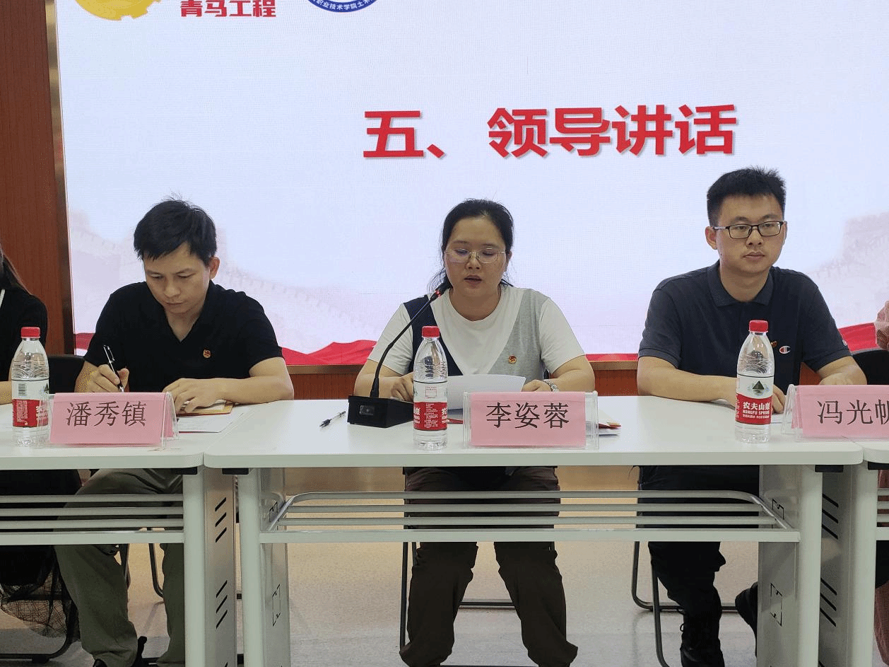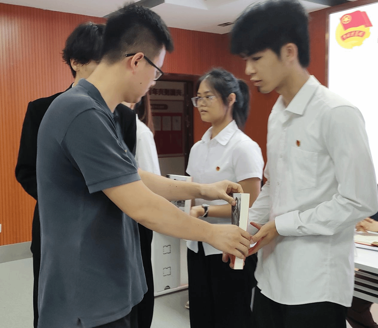 林春燕同学作为学员代表发言。她号召全体学员努力在专业学习上做标杆、在学生工作中当模范、在志愿实践上见行动。随后,团总支副书记、学生党支部书记潘秀镇宣读培训班班委名单。团总支书记冯光帆向班委赠书。