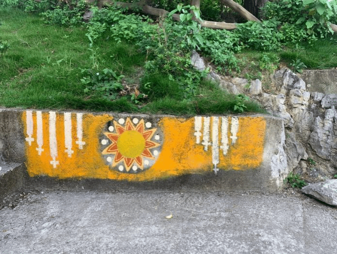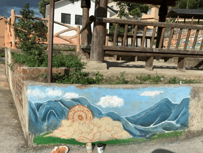 调研学习之余,“育美乡情”实践团为群众办好惠民实事。在南丹县朵努社区开展小微景观画绘制过程中,实践团清理10余处破旧墙面、道路岩石表面、村道路面,结合白裤瑶族文化特色、传统习俗和历史故事,完成具有白裤瑶族特色的小微图景12幅,为少数民族社区营造美育特色和艺术氛围。实践团积极与都安县澄江镇自成村共建大学生美育实践基地,在助力群众建造“小微菜园”过程中,实践团立足美育特长和建筑专业,不惧骄阳、团结协作,帮助群众设计圈建“小微菜园”共40余平方米,取得阶段性成果。