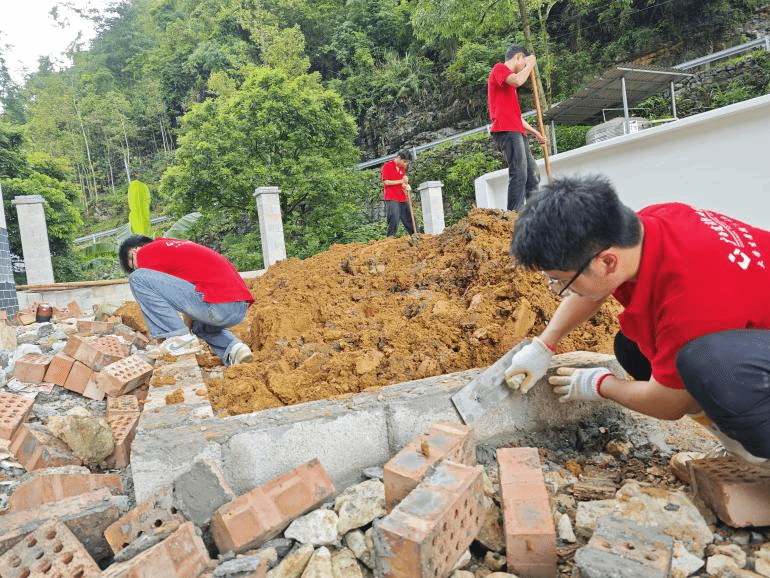 实践团在都安县澄江镇自成村“小微菜园”进行砌筑