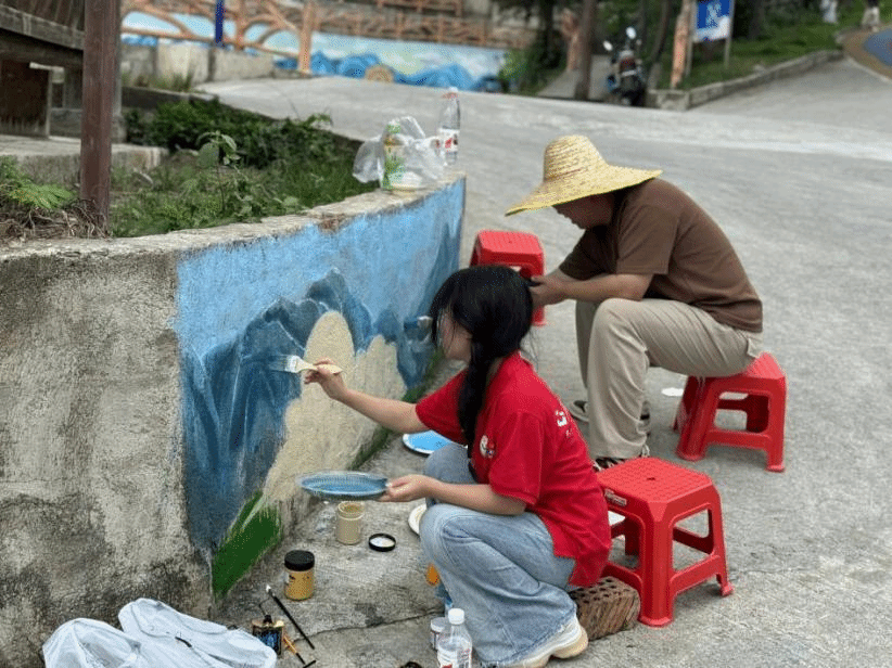 实践团成员在南丹县里湖瑶族乡朵努社区破旧墙面绘制小微景观图