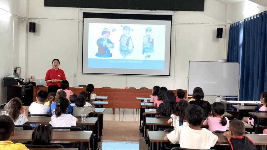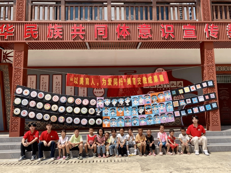 “育美乡情”实践团与朵努社区共建大学生美育实践基地,为南丹县朵努社区留守儿童精心设计美育支教课程,结合白裤瑶族文化,面向近200名留守儿童开展了白瑶童帽绘画、猴棍舞、红色歌曲传唱、普通话培训等为期3天的课程教学,指导白裤瑶族留守儿童完成绘画作品120幅,举办2场“以美育人,为爱同行”美育支教成果展,并自发筹款向白裤瑶族留守儿童捐赠水彩笔等美育教学用具182套,充分表达对当地留守儿童的关爱。