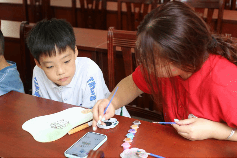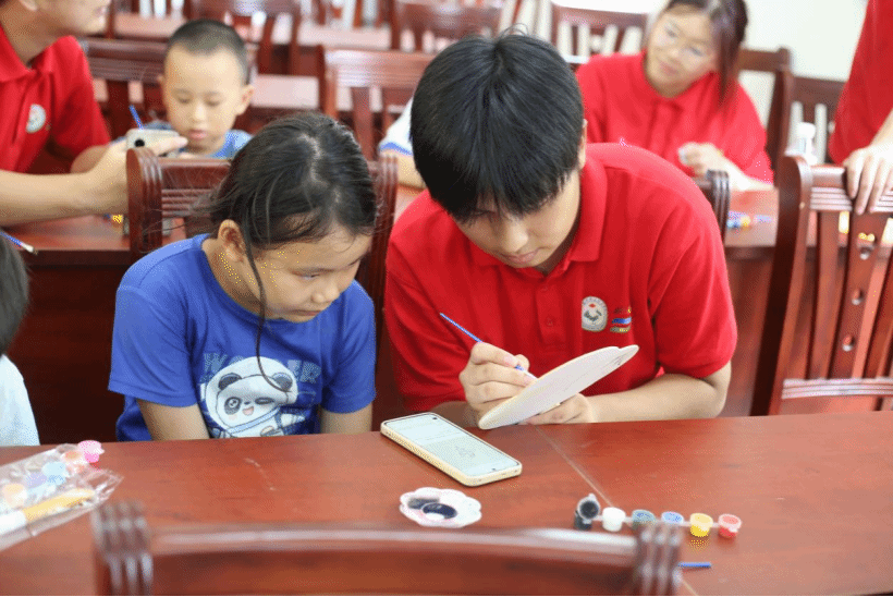 为推进少年儿童的生态文明理念教育,激发全社会共同呵护生态环境的内生动力,实践团成员在甘湾村开展了一场别开生面的植物扇子手绘课堂。课上,实践团成员以通俗易懂的语言为孩子们科普植物知识,并“一对一”指导孩子们在扇面上绘画植物。在实践团耐心细致地教导下,原本平平无奇的扇子在孩子们稚朴的笔触下变成一把把充满童真、别具特色的手绘扇,稚嫩的脸庞上也扬起了灿烂的笑容。