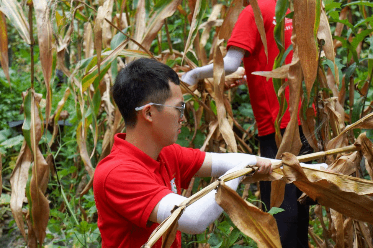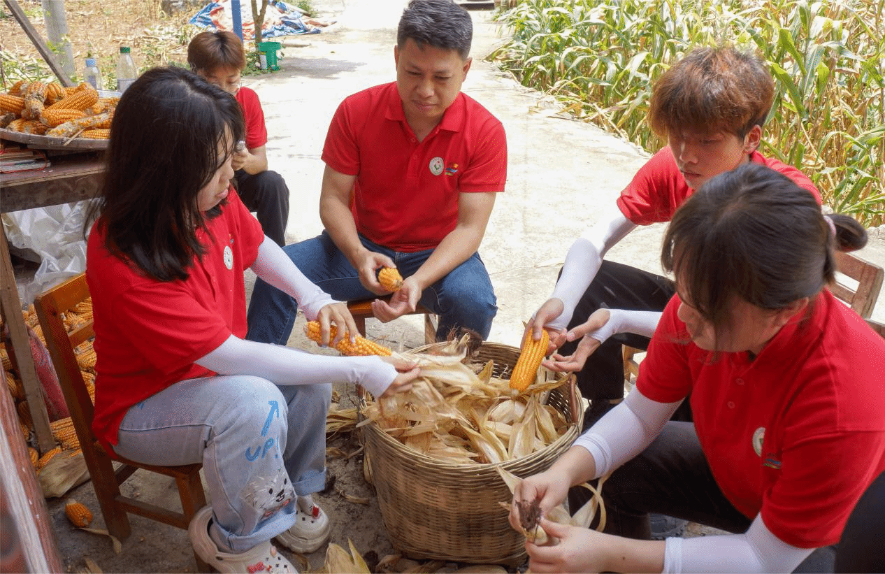 实践团成员帮当地农民收玉米、掰玉米