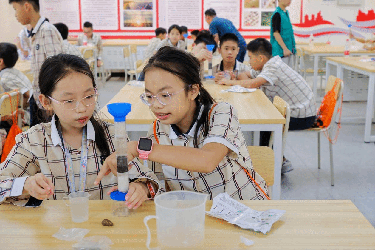 参观了各类展馆之后,各小组开始了下一步的研学活动。来到圆桌教室,老师们为小朋友们讲解了相关知识,“什么是海绵城市?”“如何做到雨水资源化利用?”为了让小朋友们更加深入地了解其中的奥秘,研学活动还安排了实践操作环节。在志愿者们的指导下,小朋友们分组进行了趣味净水小实验,将理论知识转化为实际操作,不仅锻炼了动手能力,还加深了对净水知识的理解。