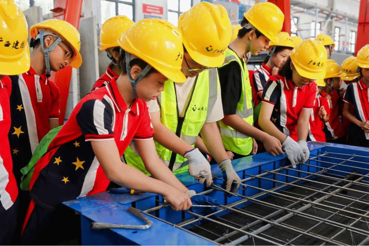 小朋友们在专业人员的指导下,体验捆扎楼板钢筋