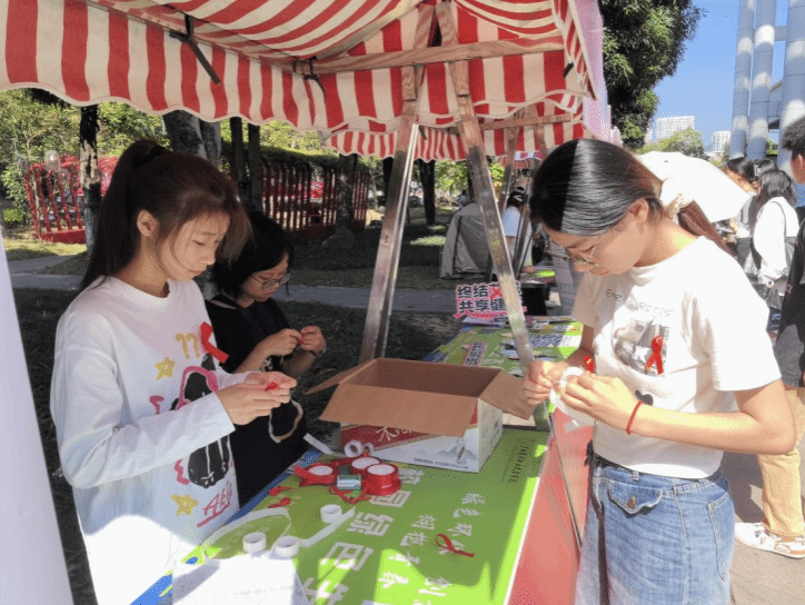 志愿者与同学们一起制作红丝带