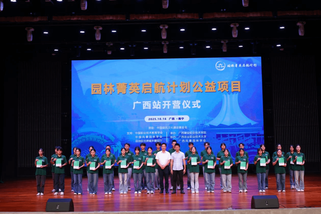 广西建院10月18日讯(通讯员 江汇)秋日正好,绿意满城。10月16日下午,“园林菁英启航计划”公益项目(广西站)开营仪式在完美(中国)官方礼堂顺利举行。自治区住房和城乡建设厅党组成员、副厅长于斌,中国职业技术教育学会副理事长花景新,中国益民文化建设基金会理事长刘霞,中国益民文化建设基金会风景园林专项基金管委会主任唐进群等领导专家出席仪式。开营仪式由中国益民文化建设基金会副理事长兼秘书长张晓丽主持。学校党委书记刘晓红出席仪式,并为入选学员授旗。
