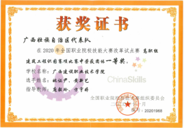 2020年全国职业院校技能大赛改革试点赛高职组“建筑工程识图赛项”获国家级一等奖(排名第一) | 在2020年全国职业院校技能大赛改革试点赛“建筑工程识图赛项”比赛中荣获优秀指导教师奖 |