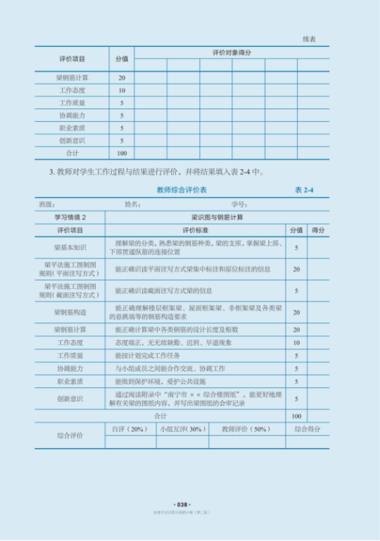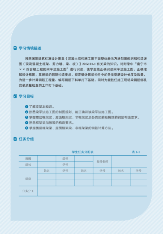 一是校企协同,组建多元教材开发团队打造高质量教材。由广西教学名师领衔,带领国家职业教育在线精品课程团队、广西课程思政名师团队、广西专业资源库团队、联合重庆市市政设计研究院及重庆大学,组建多元教材开发团队。团队均为双师型教师,主编拥有15年以上企业经历。团队以分析典型工作任务,对接专业标准,以“土木建筑工程技术人员”岗位需求为导向,以培养平法施工图识读能力为核心,选取实际项目为载体,采用项目引导、任务驱动方法,构建“任务+案例+学训”教学情境,打造“教学训”一体化教材。