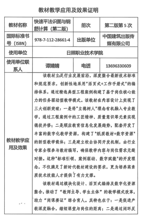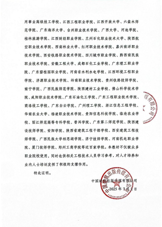 教材被多所中高职院校、职业教育本科院校的建筑工程技术、智能建造技术等建筑类相关专业选用,应用覆盖面大,应用效果好。如:日照职业技术学院、江西交通职业技术学院、广西水利电力职业技术学院、广西城市建设学校、闽西职业技术学院等。