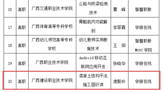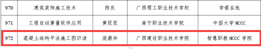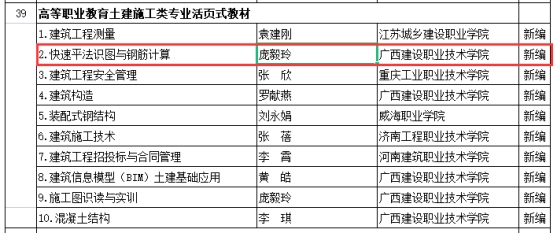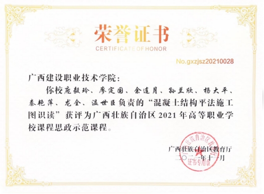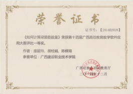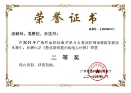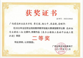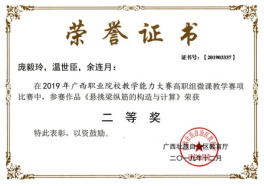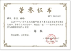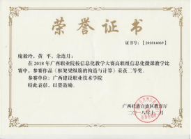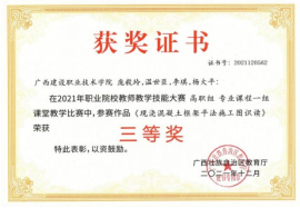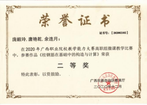 在2020年广西职业院校教学能力大赛高职组微课教学比赛中,参赛作品《柱纵筋插入基础中的构造与计算》荣获二等奖 | 在2019年广西职业院校教学能力大赛高职组微课教学赛项比赛中,参赛作品《悬挑梁纵筋的构造与计算》荣获二等奖 |