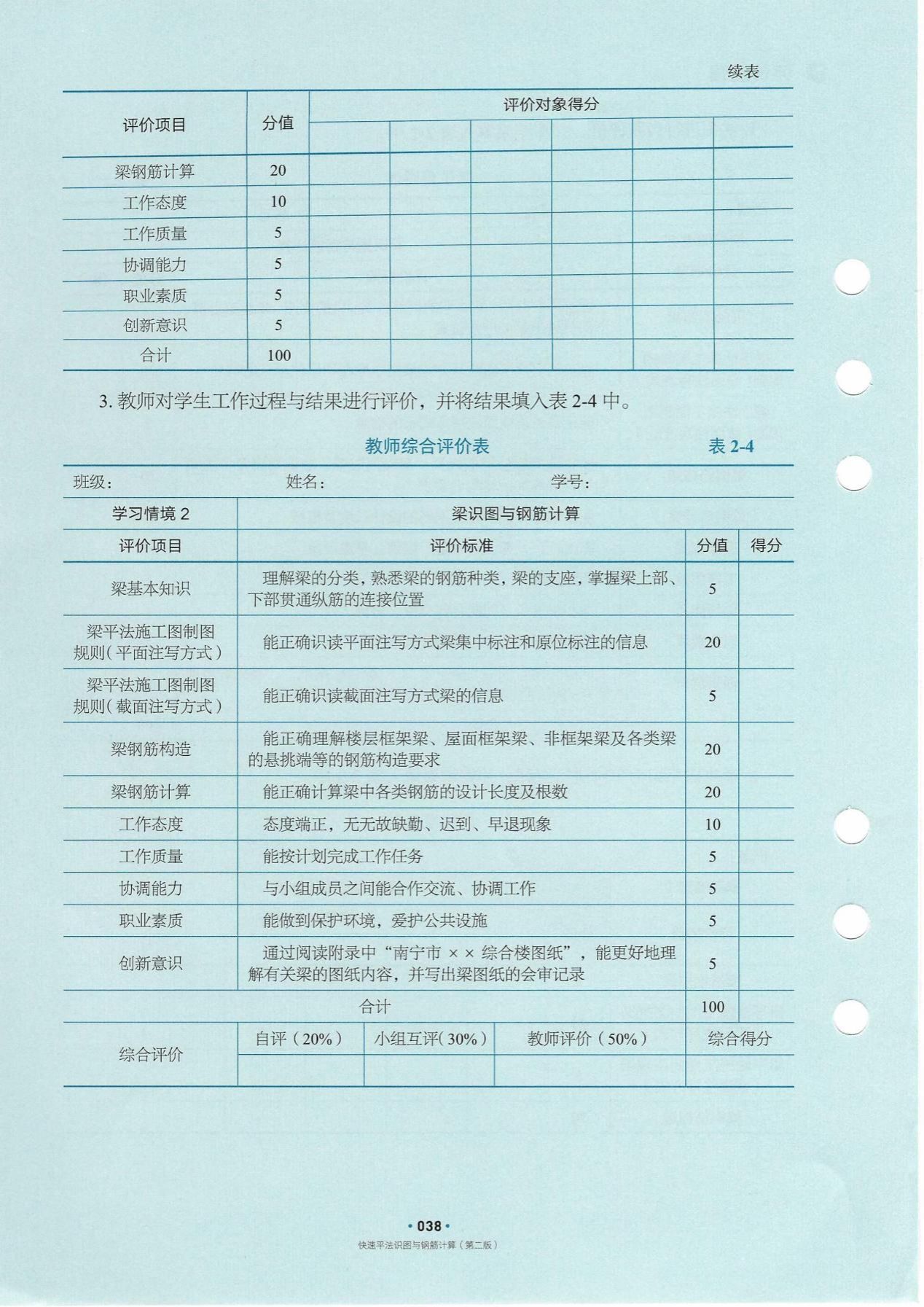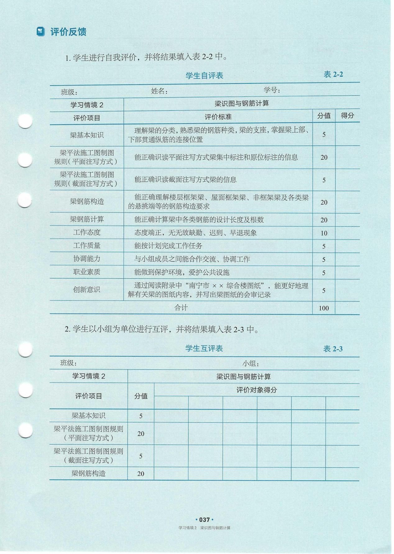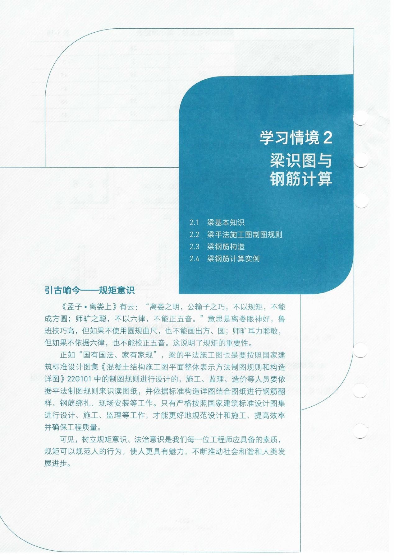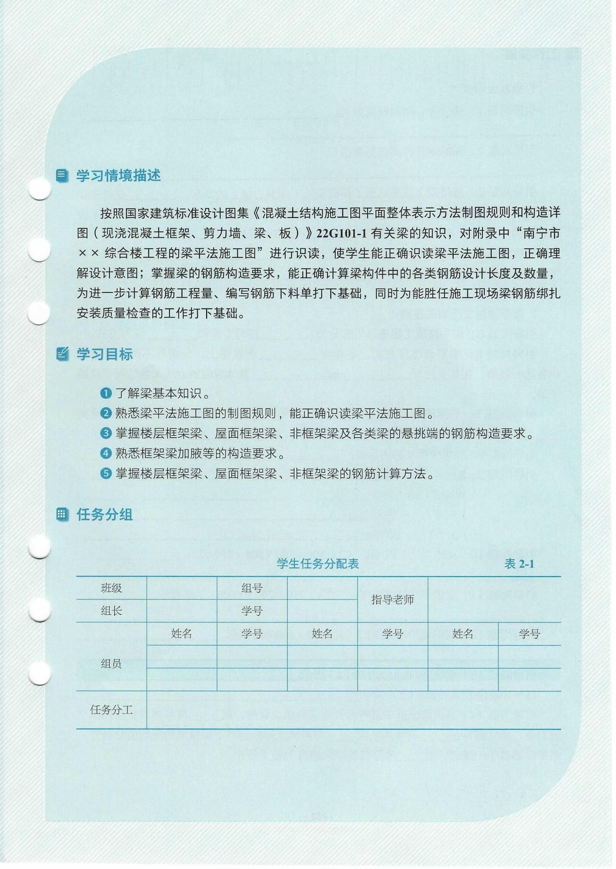 以南宁市XX综合楼项目为载体,通过混凝土结构识图、钢筋计算等实践案例,将钢筋下料、绑扎、安装等施工流程转化为学习情境与实操环节,各情境深入挖掘《荀子·劝学篇》等中华优秀传统文化育人元素,融合工程规范与施工实践,潜移默化培育学生法治观念与劳动精神。设计符合学生认知规律的阶梯式技能点,融入终身学习等国际教育理念,以活页式实现模块化教学灵活落地,开发微课、BIM模型等数字资源辅助教学,支持移动扫码学习,依托精品课程打造“可视、可练、可互动”学习环境,同时兼顾“中—高—本”教育衔接。