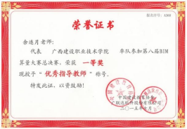 余连月指导学生参加第八届BIM算量大赛总决赛获一等奖,被授予“优秀指导教师”称号 | 指导学生参加第九届BIM算量大赛总决赛获一等奖,被授予“优秀指导教师”称号 |