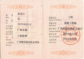 余连月国家注册监理工程师职业资格证书1 | 余连月国家注册监理工程师职业资格证书2 |