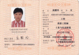 庞毅玲教授职称证书 | 庞毅玲高级工程师职称证书 |