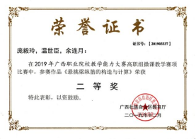 在2020年广西职业院校教学能力大赛高职组微课教学比赛中,参赛作品《柱钢筋在基础中的构造与计算》荣获二等奖 | 在2019年广西职业院校教学能力大赛高职组微课教学赛项比赛中,参赛作品《悬挑梁纵筋的构造与计算》荣获二等奖 |