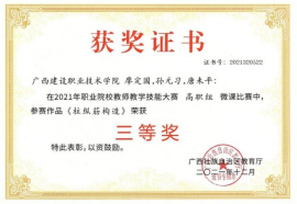 《柱纵筋构造》获2021年广西职业院校教师教学技能大赛高职组微课教学比赛三等奖 | 《建筑结构受弯构件的合理设计》荣获第十四届广西高校教育教学软件应用大赛评比三等奖 |