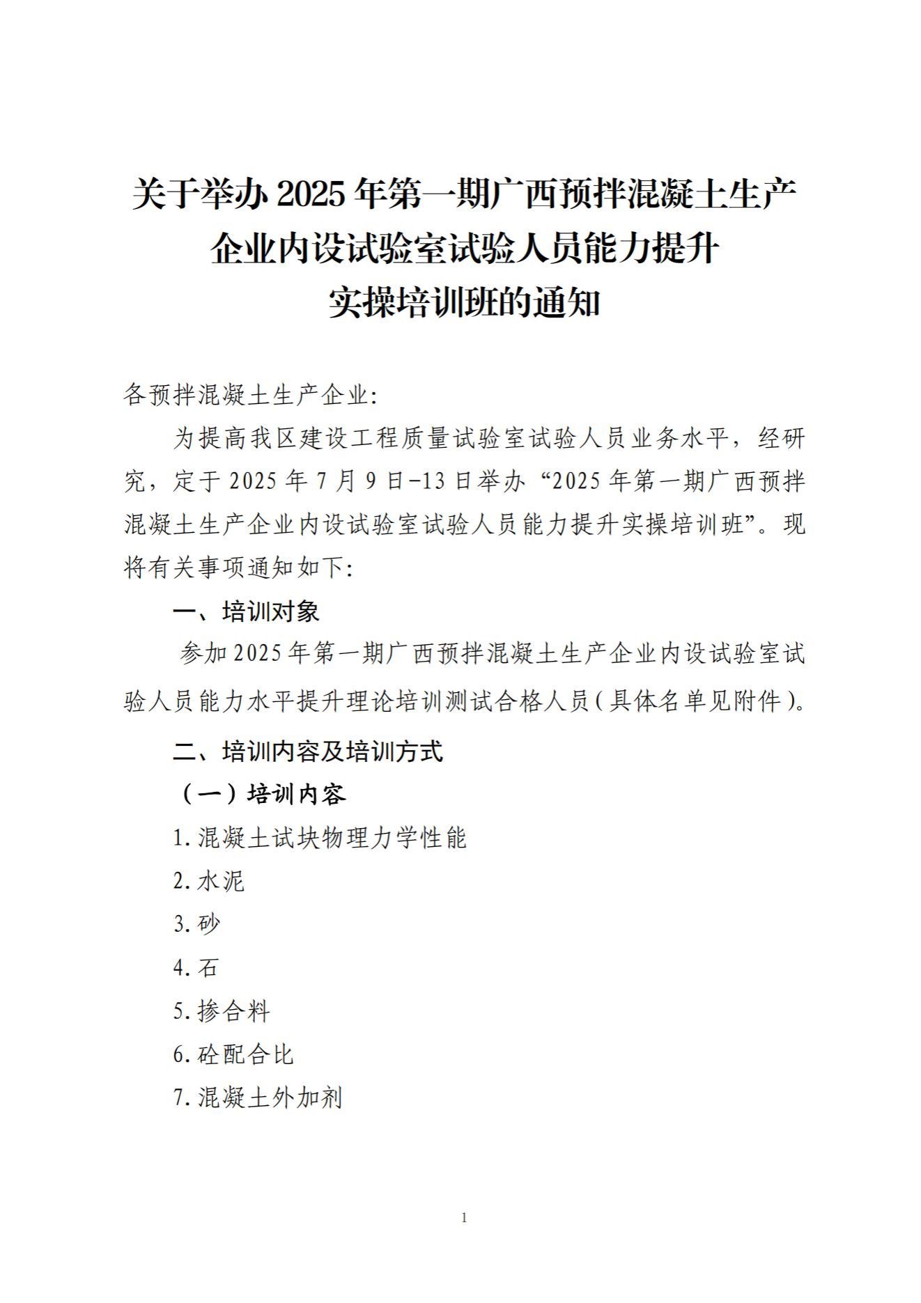 关于举办2025年第一期广西预拌混凝土生产企业内设试验室试验人员能力提升培训实操班的通知