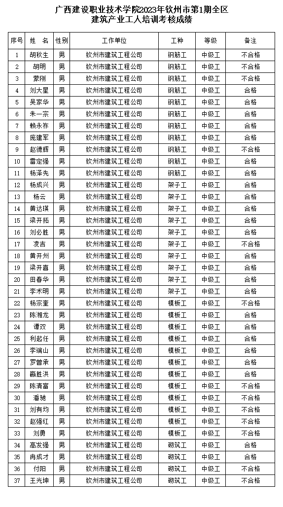 附件:完美网页版2023年钦州市第1期全区建筑产业工人培训考核成绩