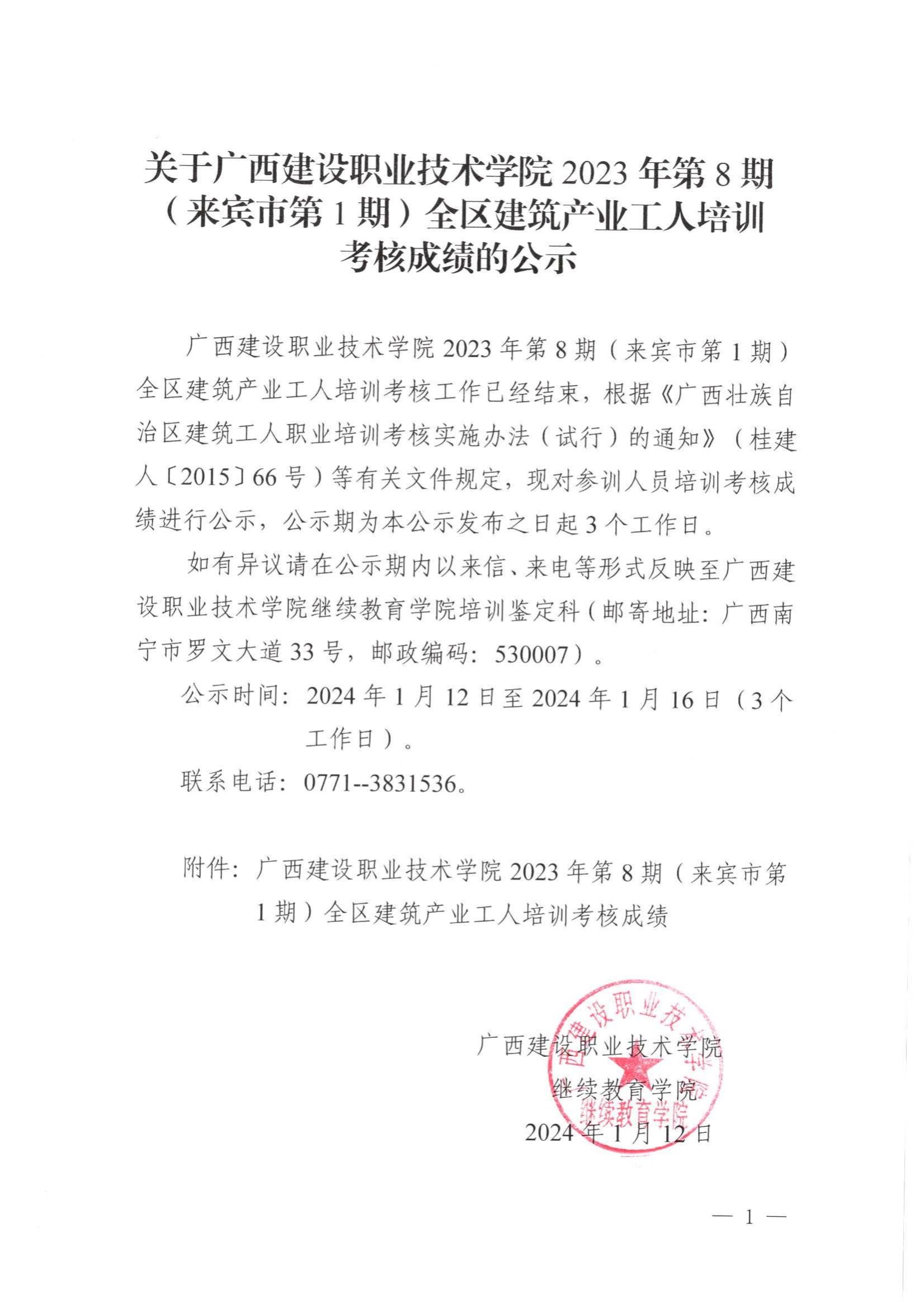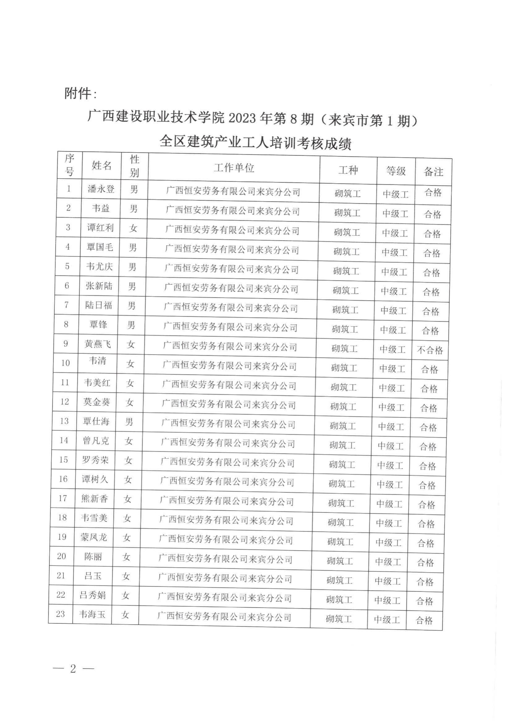 培训信息 当前位置: 首页 >> 培训信息 >> 正文 关于完美网页版2023年全区建筑产业工人第8期(来宾市第1期)培训考核成绩的公示 发布日期:2024-01-12 点击: 附件【关于完美网页版2023年全区建筑产业工人第8期(来宾市第1期)培训考核成绩的公示 .pdf】已下载次