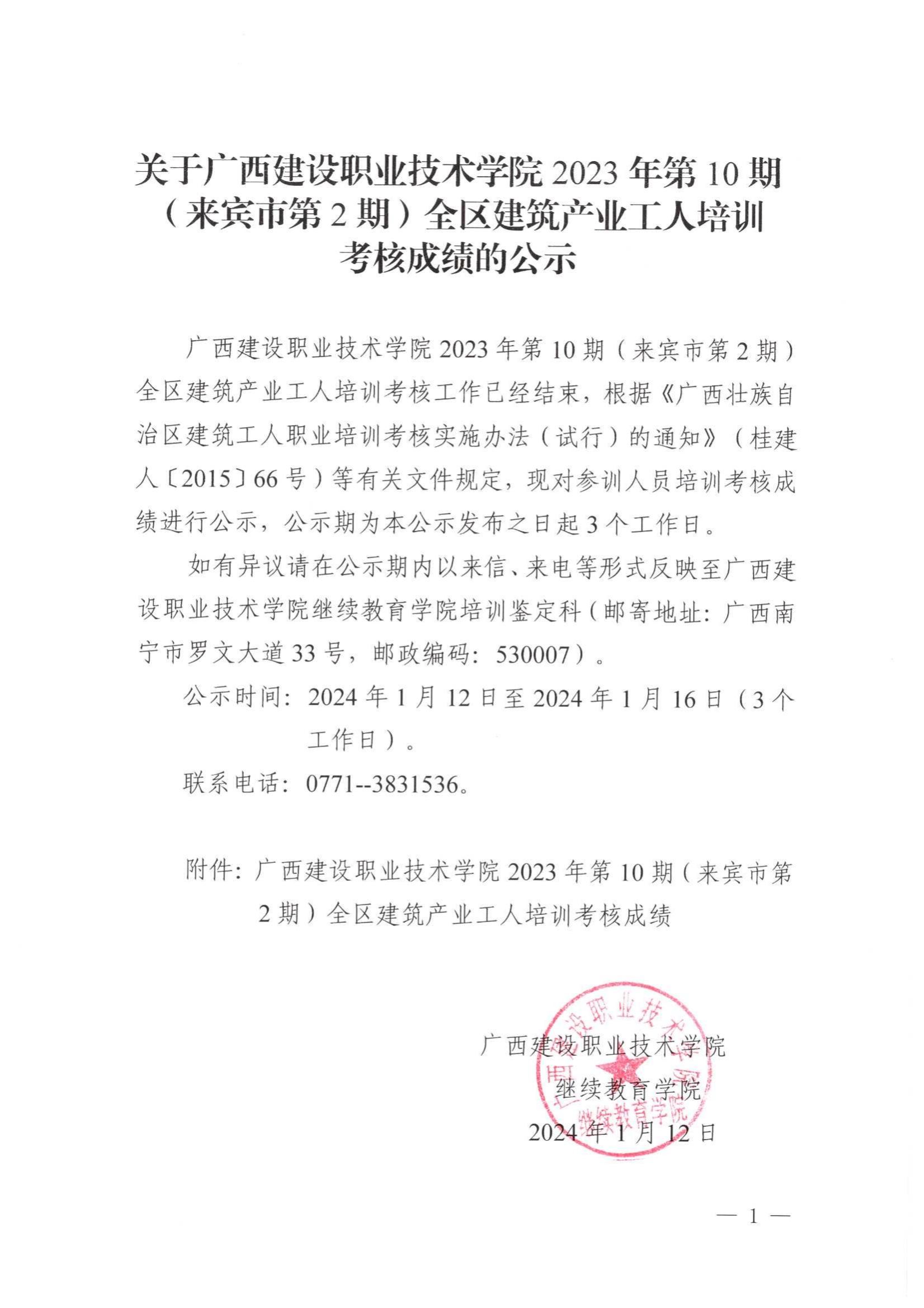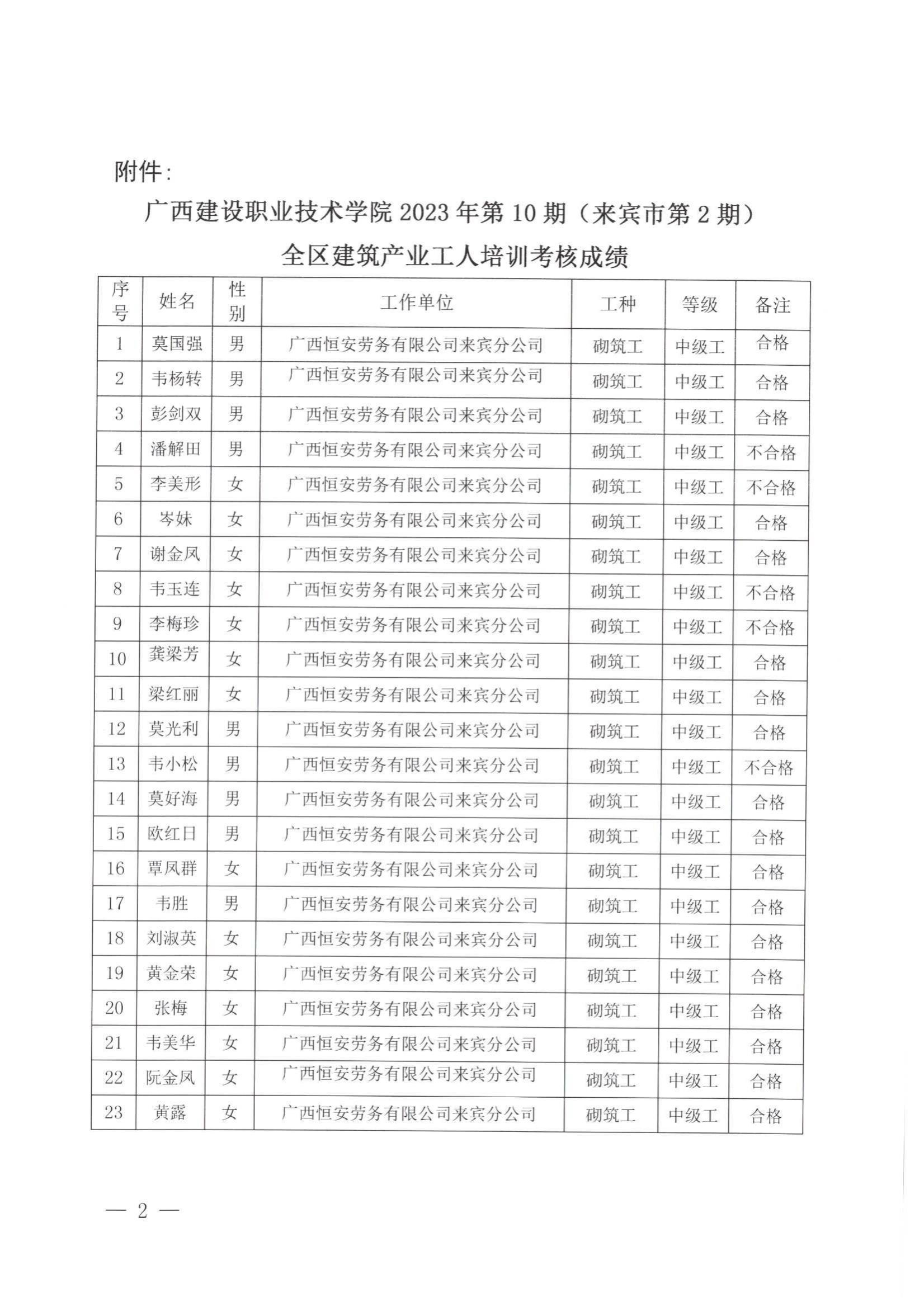 培训信息 当前位置: 首页 >> 培训信息 >> 正文 关于完美网页版2023年全区建筑产业工人第10期(来宾市第2期)培训考核成绩的公示 发布日期:2024-01-12 点击: 附件【关于完美网页版2023年全区建筑产业工人第10期(来宾市第2期)培训考核成绩的公示 .pdf】已下载次