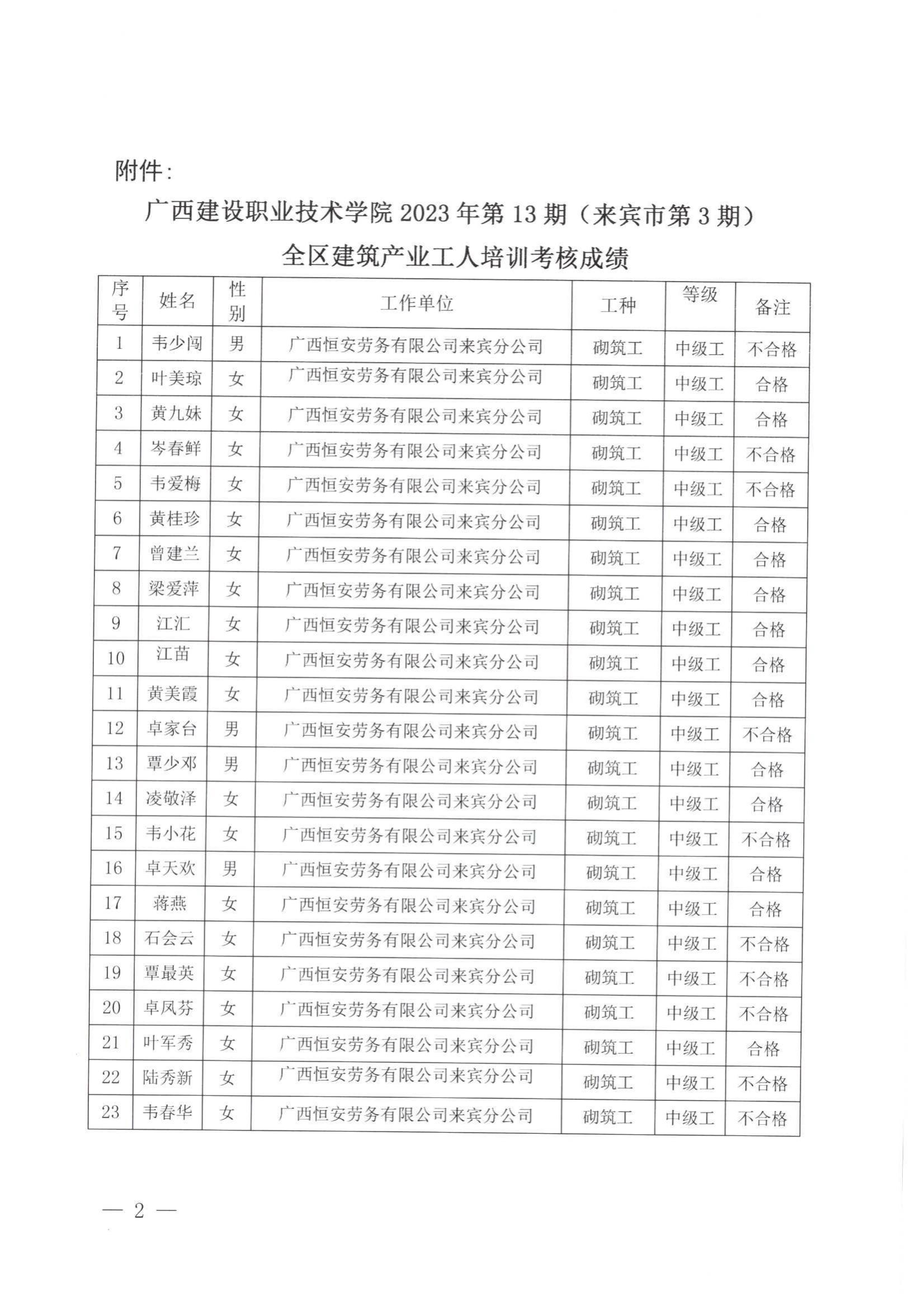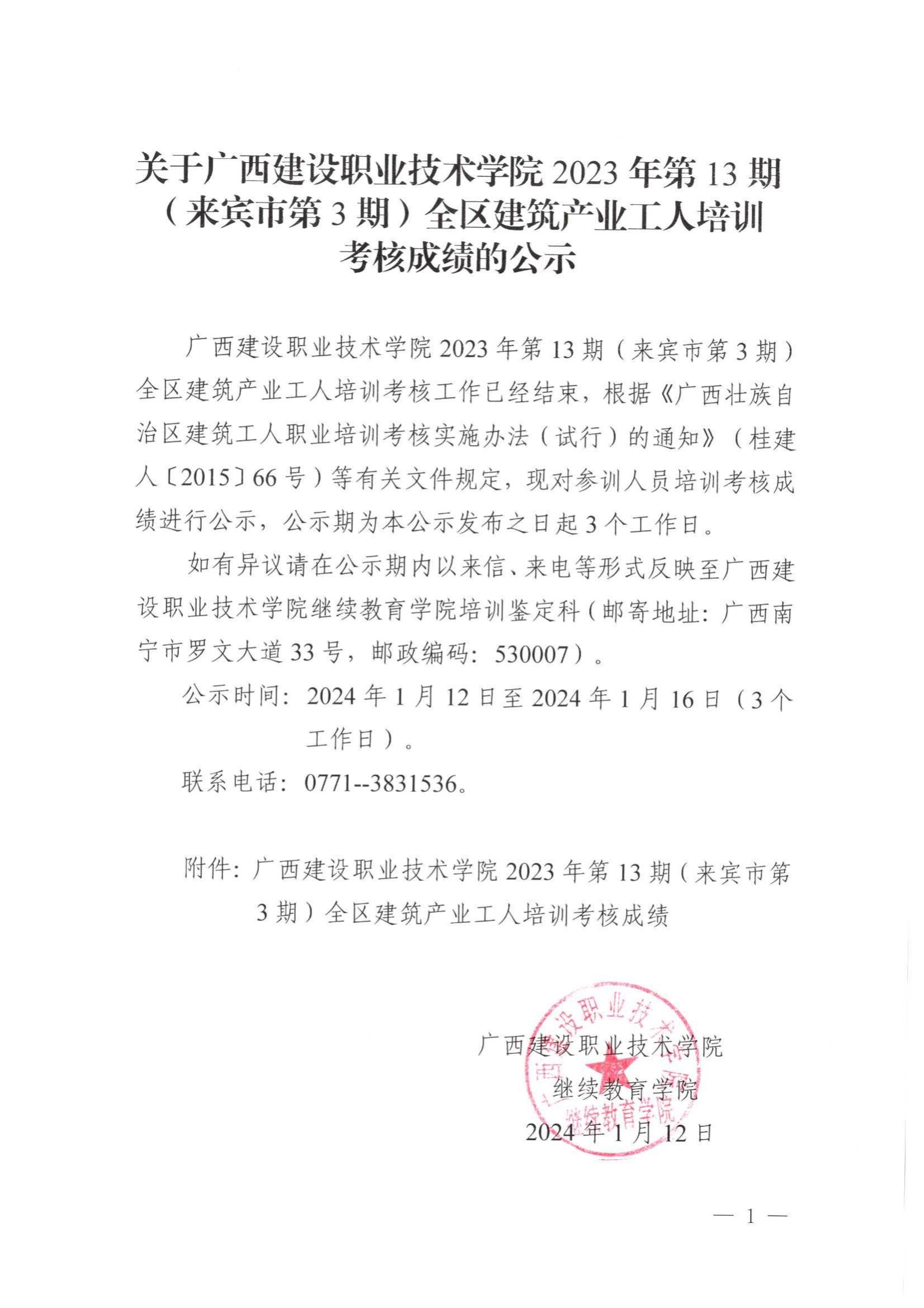 培训信息 当前位置: 首页 >> 培训信息 >> 正文 关于完美网页版2023年全区建筑产业工人第13期(来宾市第3期)培训考核成绩的公示 发布日期:2024-01-12 点击: 附件【关于完美网页版2023年全区建筑产业工人第13期(来宾市第3期)培训考核成绩的公示 .pdf】已下载次