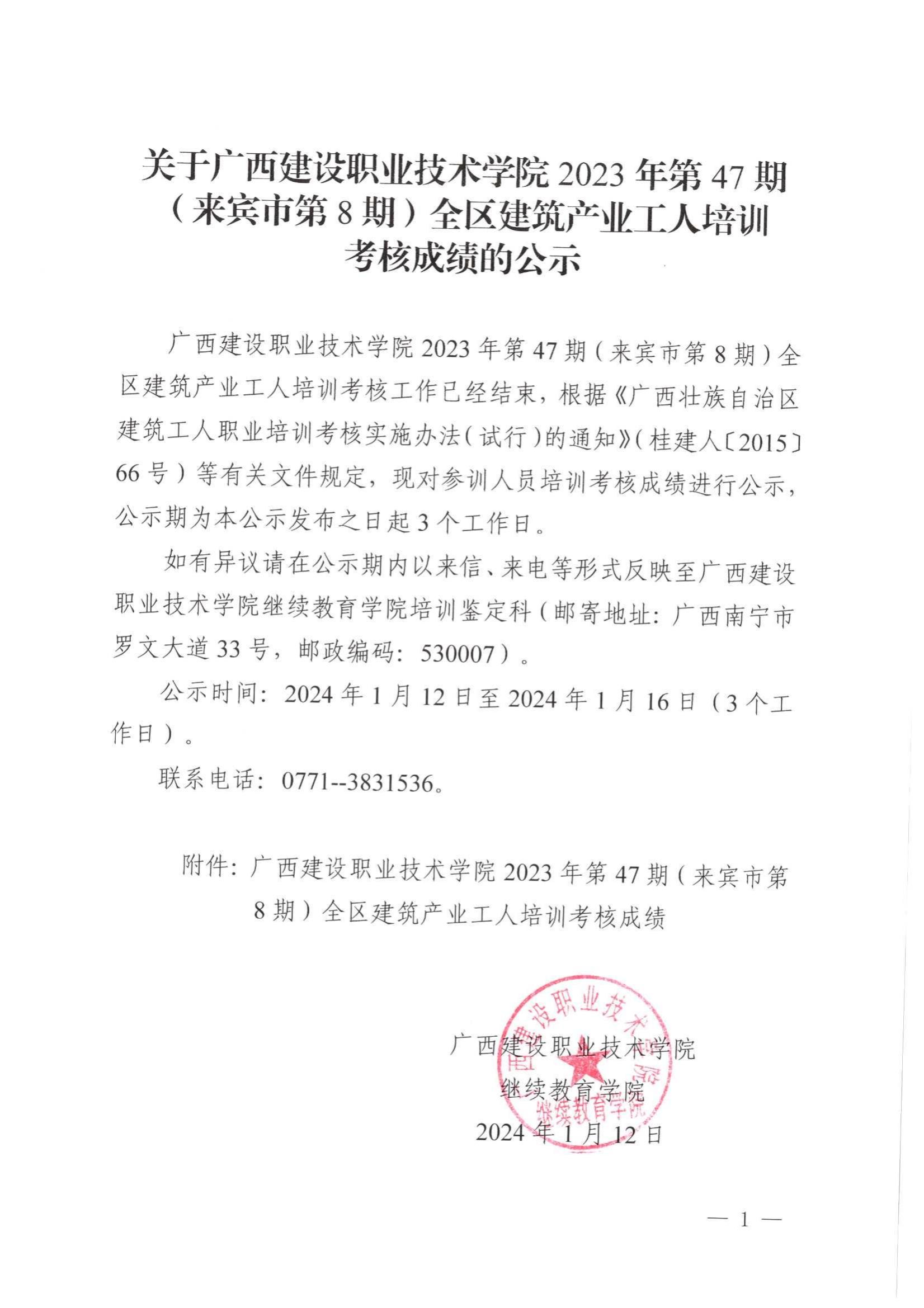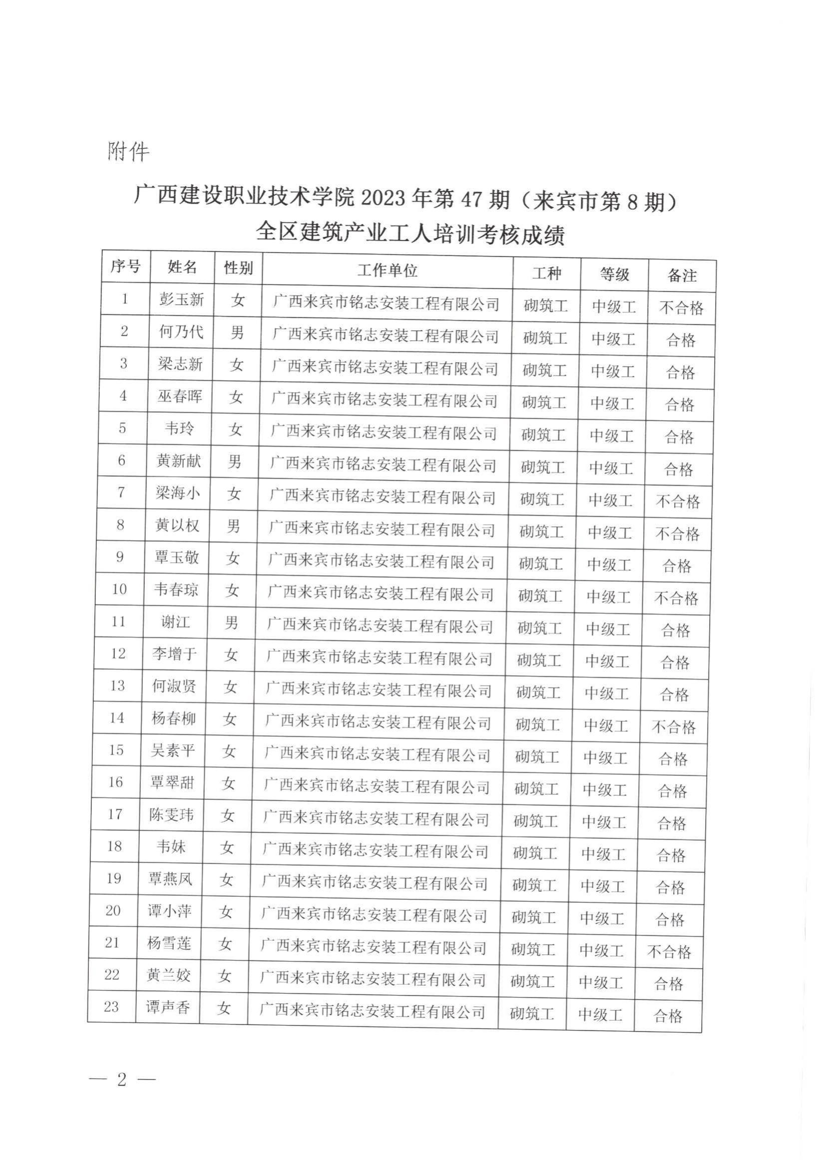 培训信息 当前位置: 首页 >> 培训信息 >> 正文 关于完美网页版2023年全区建筑产业工人第47期(来宾市第8期)培训考核成绩的公示 发布日期:2024-01-12 点击: 附件【关于完美网页版2023年全区建筑产业工人第47期(来宾市第8期)培训考核成绩的公示.pdf】已下载次