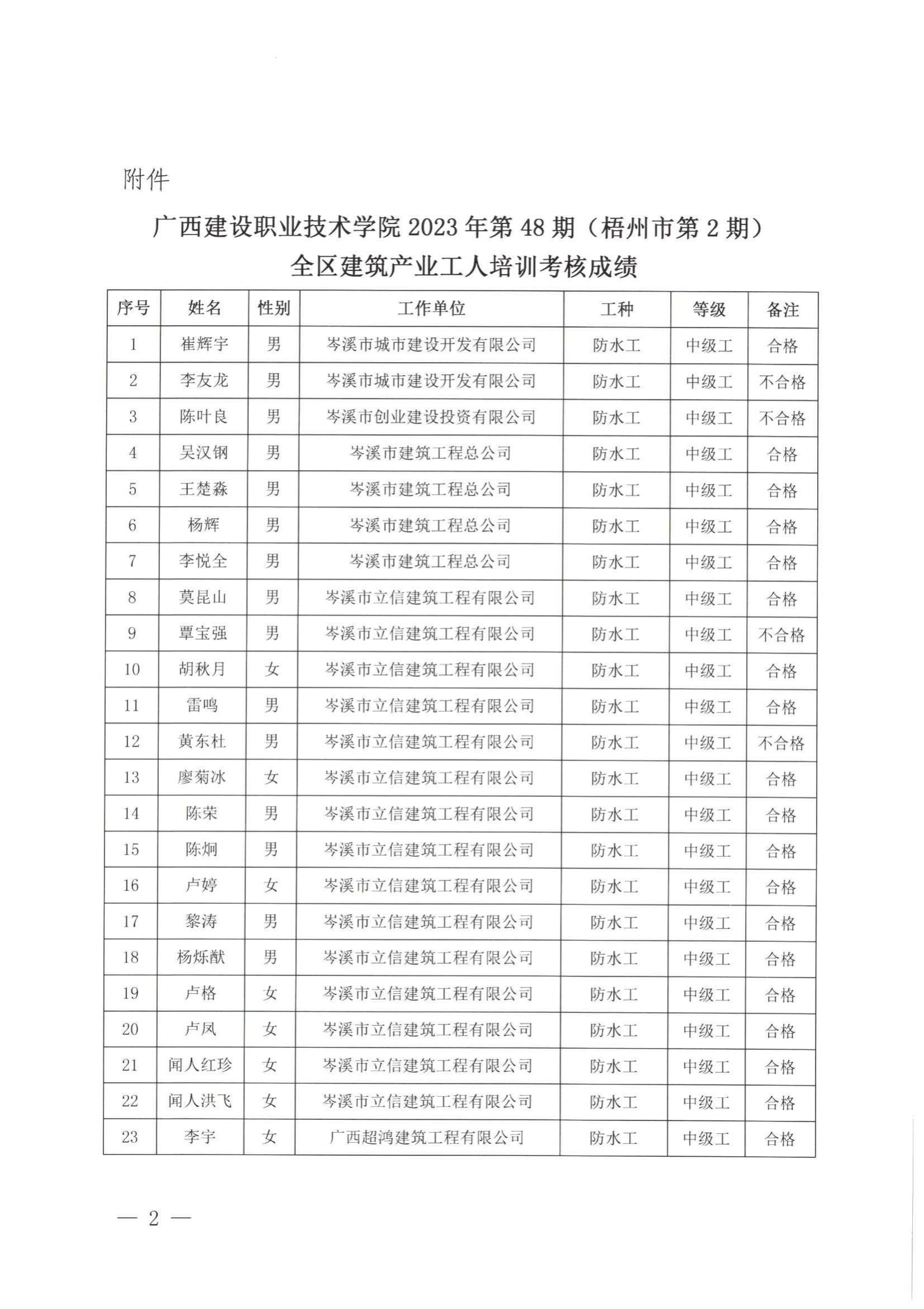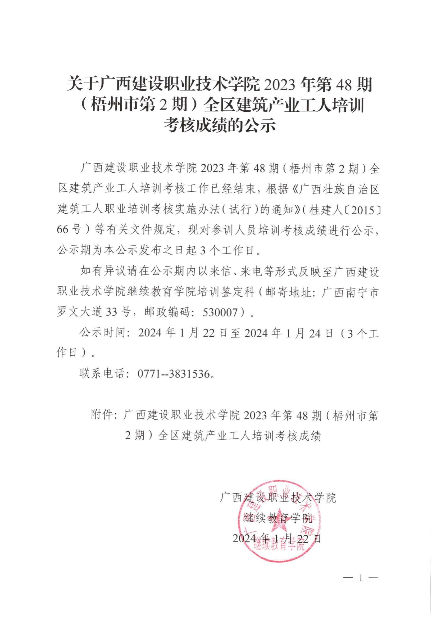 培训信息 当前位置: 首页 >> 培训信息 >> 正文 关于完美网页版2023年全区建筑产业工人第48期(梧州市第2期)培训考核成绩的公示 发布日期:2024-01-23 点击: 附件【关于完美网页版2023年全区建筑产业工人第48期(梧州市第2期)培训考核成绩的公示 .pdf】已下载次