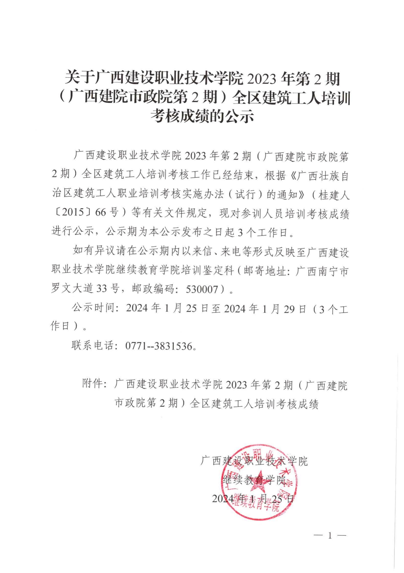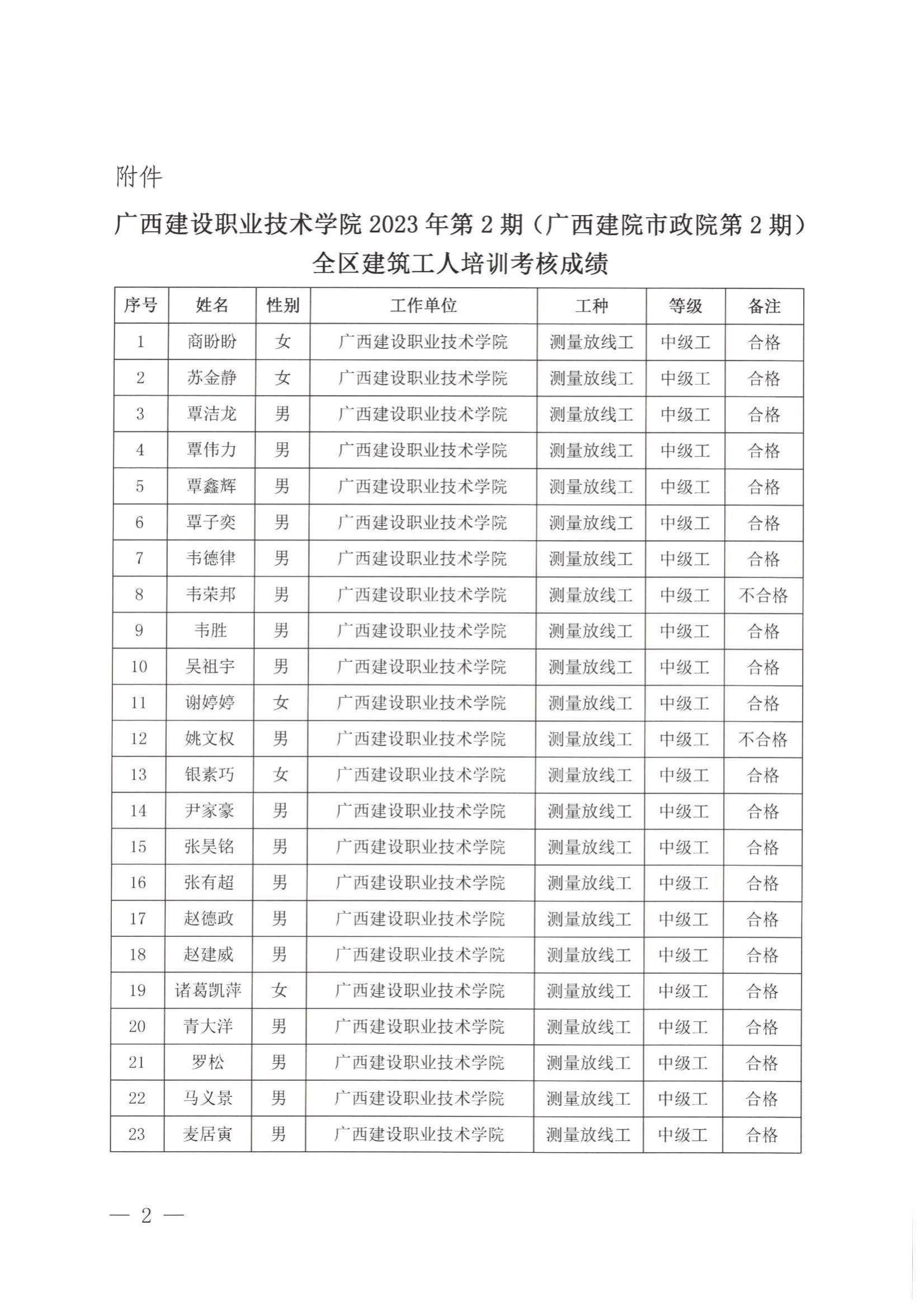 培训信息 当前位置: 首页 >> 培训信息 >> 正文 关于完美网页版2023年全区建筑工人第2期(广西建院市政院第2期)培训考核成绩的公示 发布日期:2024-01-25 点击: 附件【关于完美网页版2023年全区建筑工人第2期(广西建院市政院第2期)培训考核成绩的公示.pdf】已下载次