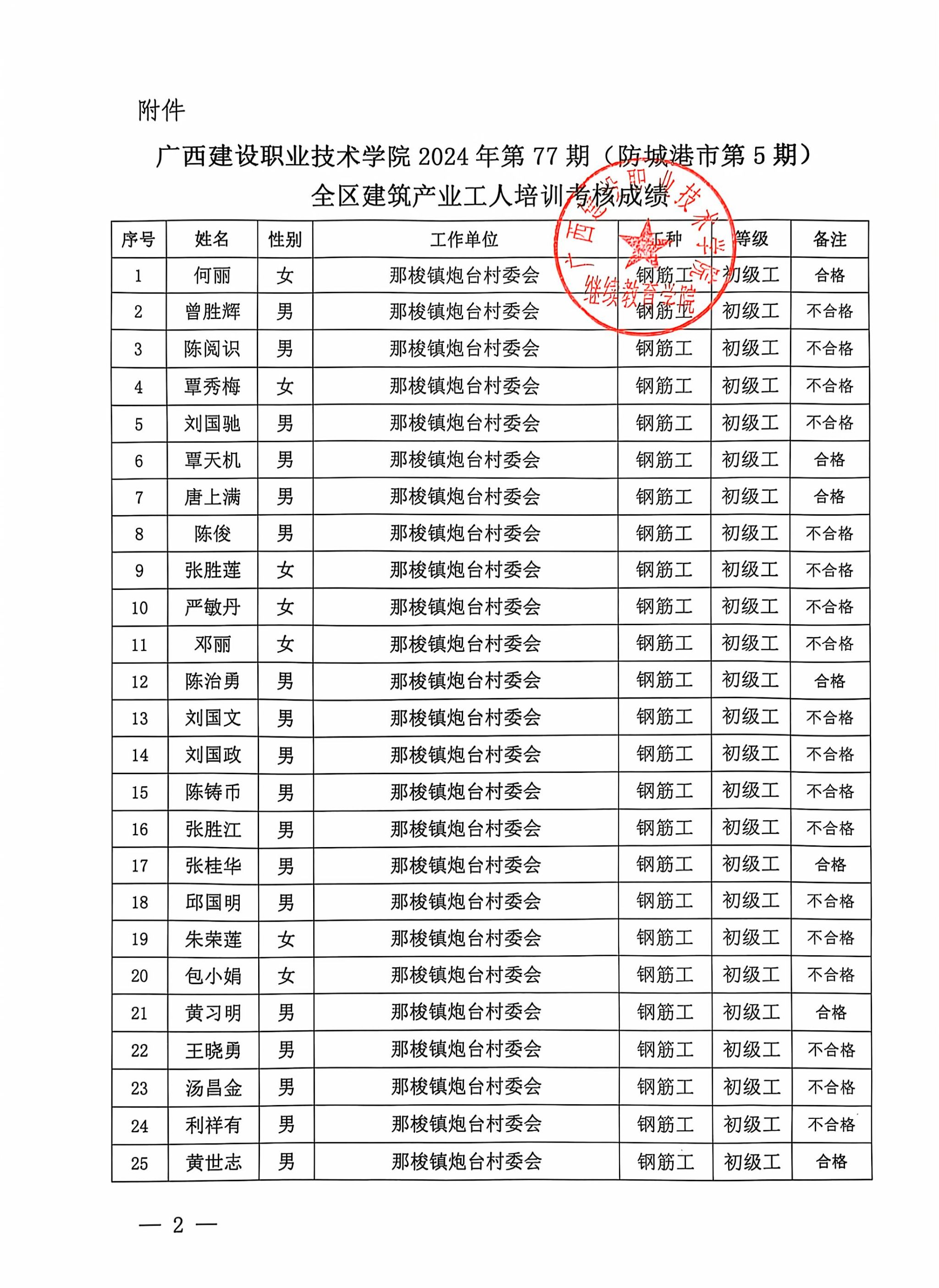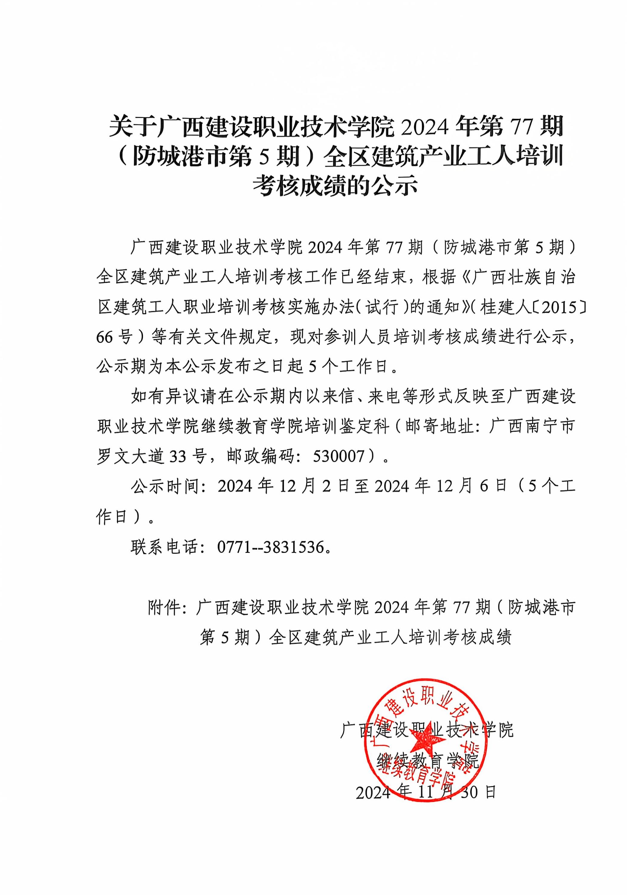 培训信息 当前位置: 首页 >> 培训信息 >> 正文 关于完美网页版2024年全区建筑产业工人第77期(防城港市第5期)培训考核成绩的公示 发布日期:2024-11-30 点击: 附件【关于完美网页版2024年全区建筑产业工人第77期(防城港市第5期)培训考核成绩的公示.pdf】已下载次