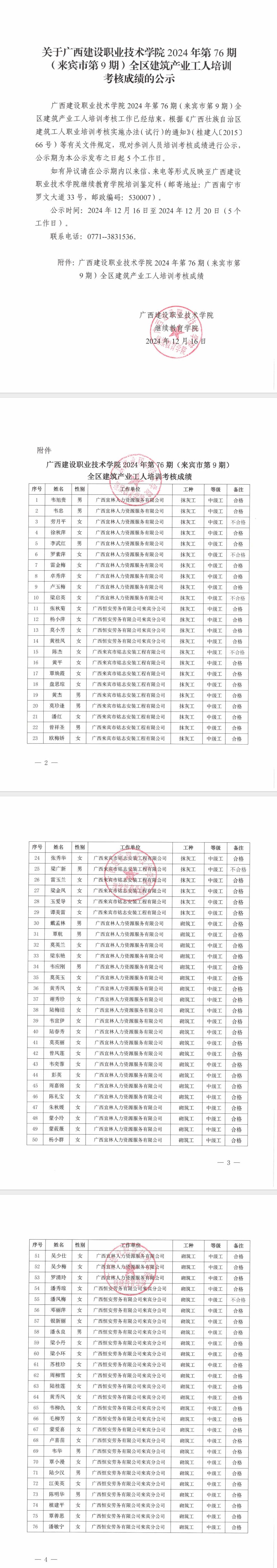 培训信息 当前位置: 首页 >> 培训信息 >> 正文 关于完美网页版2024年底76期(来宾市第9期)全区建筑产业工人培训考核成绩的公示 发布日期:2024-12-16 点击: 附件【关于完美网页版2024年底76期(来宾市第9期)全区建筑产业工人培训考核成绩的公示.pdf】已下载次