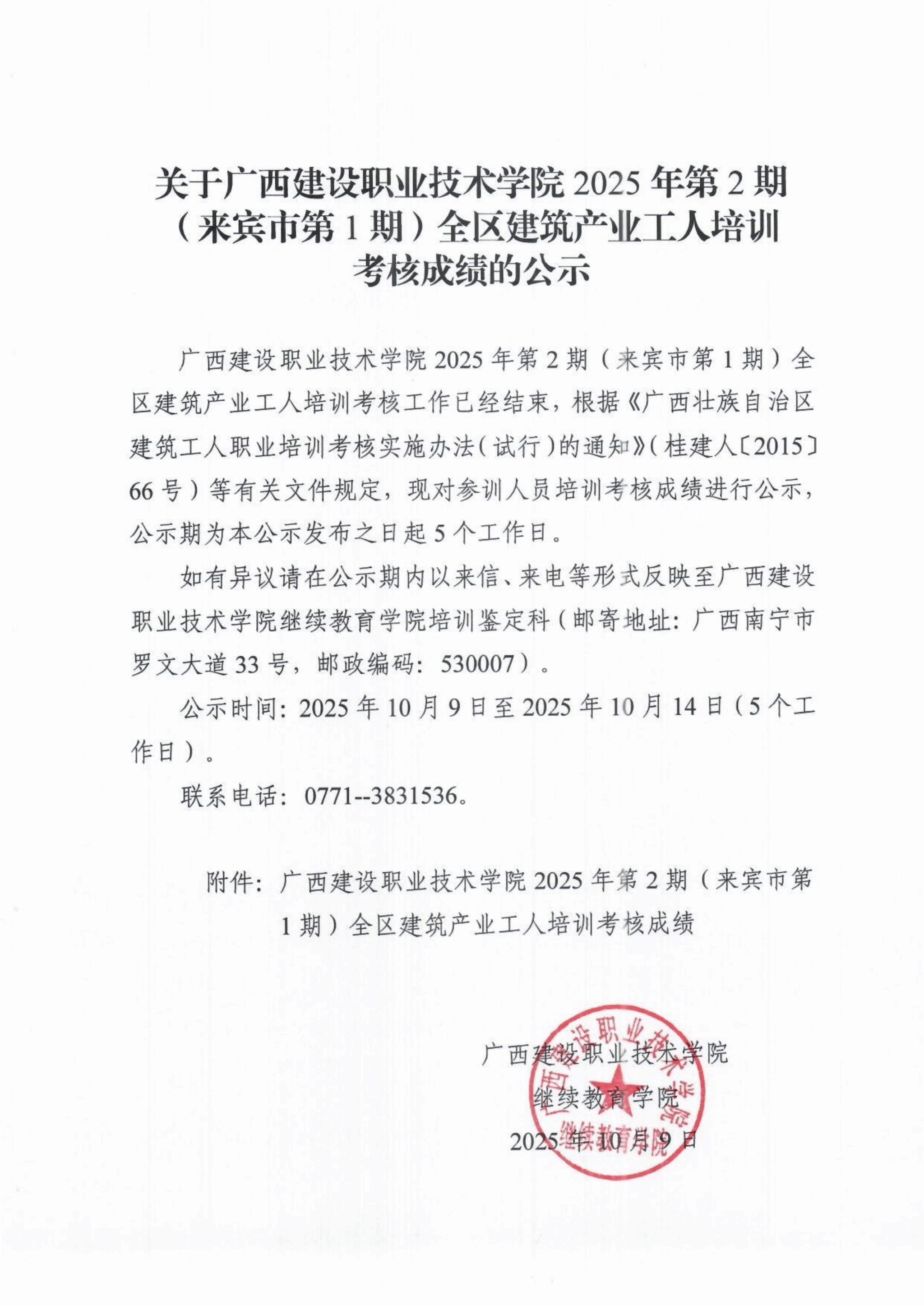 培训信息 当前位置: 首页 >> 培训信息 >> 正文 关于完美网页版2025年全区建筑产业工人第2期(来宾市第1期)培训考核成绩的公示 发布日期:2025-10-10 点击: 附件【关于完美网页版2025年全区建筑产业工人第2期(来宾市第1期)培训考核成绩的公示.pdf】已下载次