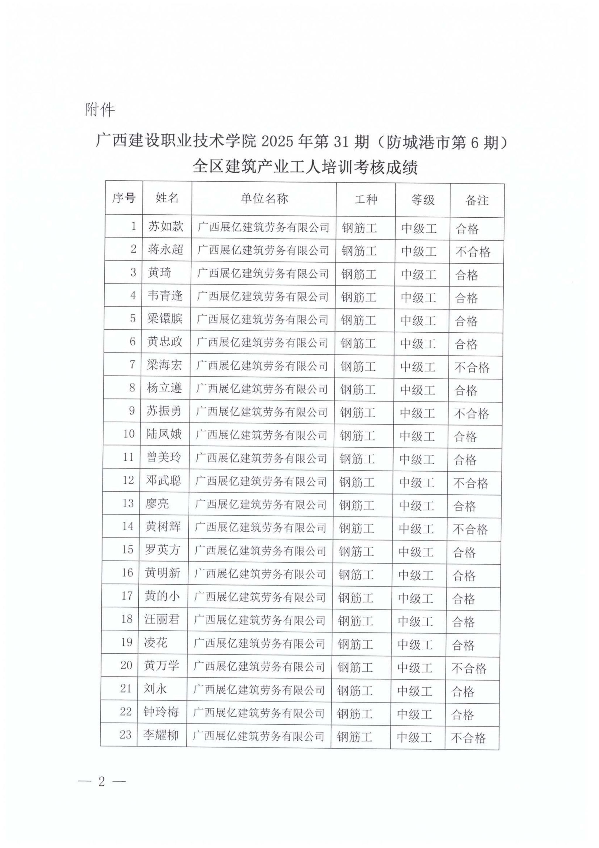 关于完美网页版2025年全区建筑产业工人第31期(防城港市第6期)培训考核成绩的公示