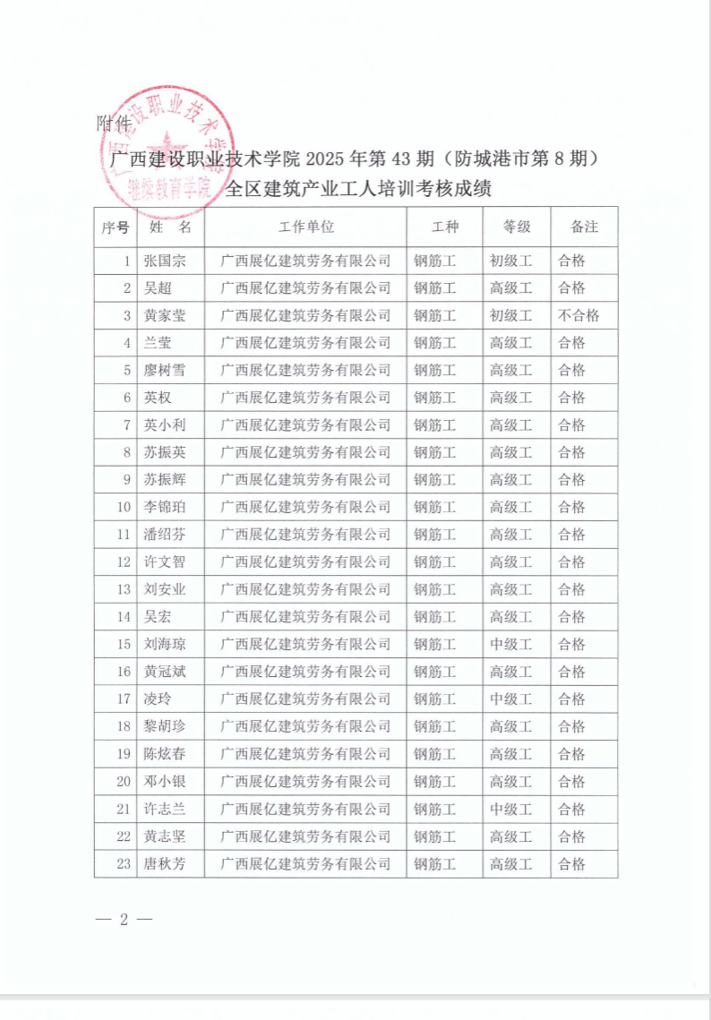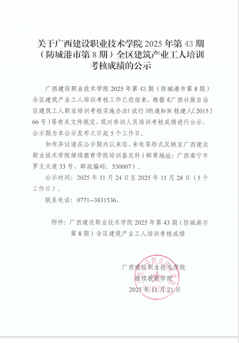 成绩公示 当前位置: 首页 >> 成绩公示 >> 正文 关于完美网页版2025年全区建筑产业工人第43期(防城港市第8期)培训考核成绩的公示 发布日期:2025-11-21 点击: 附件【关于完美网页版2025年全区建筑产业工人第43期(防城港市第8期)培训考核成绩的公示.pdf】已下载次
