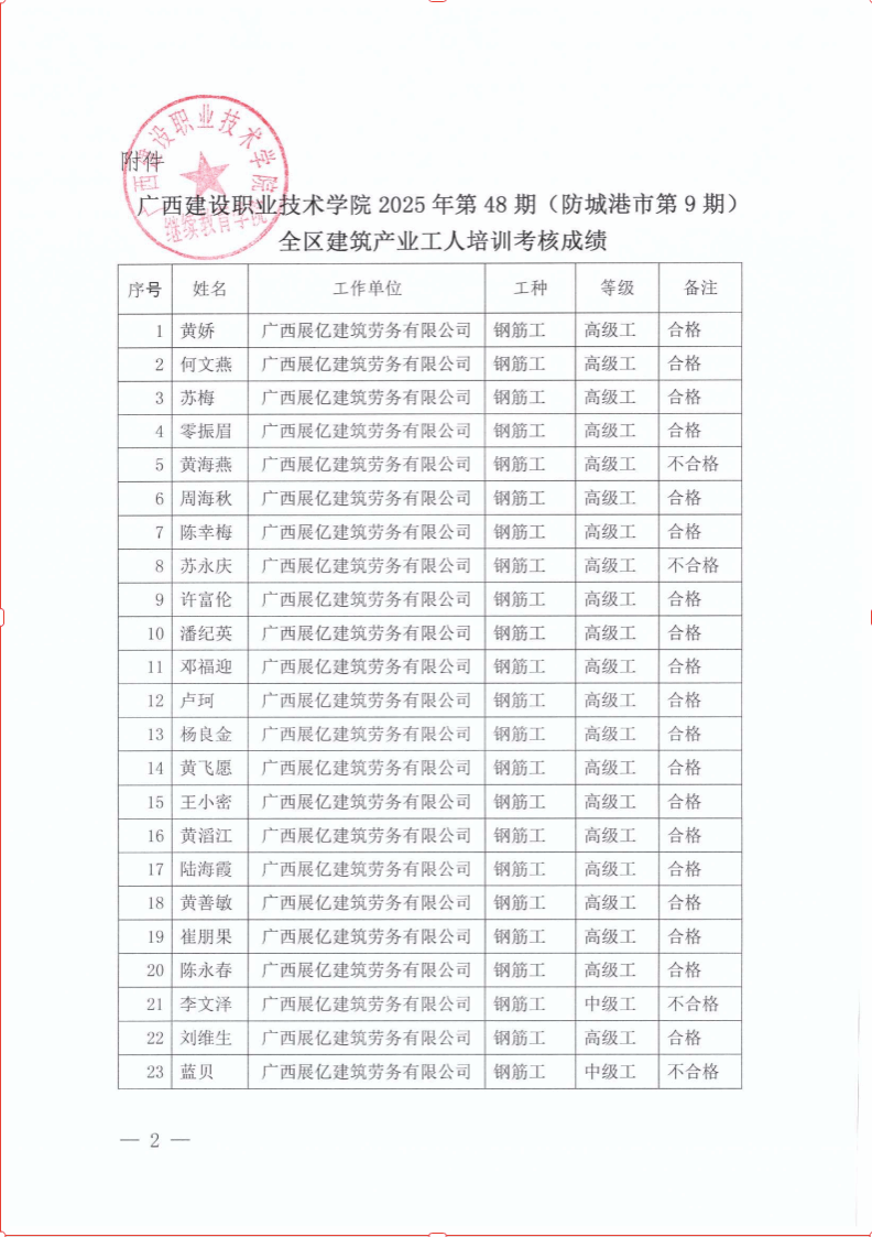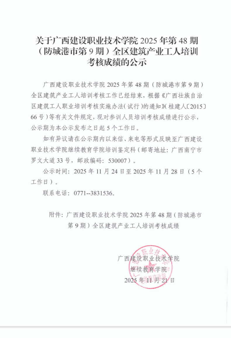 成绩公示 当前位置: 首页 >> 成绩公示 >> 正文 关于完美网页版2025年全区建筑产业工人第48期(防城港市第9期)培训考核成绩的公示 发布日期:2025-11-21 点击: 附件【关于完美网页版2025年全区建筑产业工人第48期(防城港市第9期)培训考核成绩的公示.pdf】已下载次