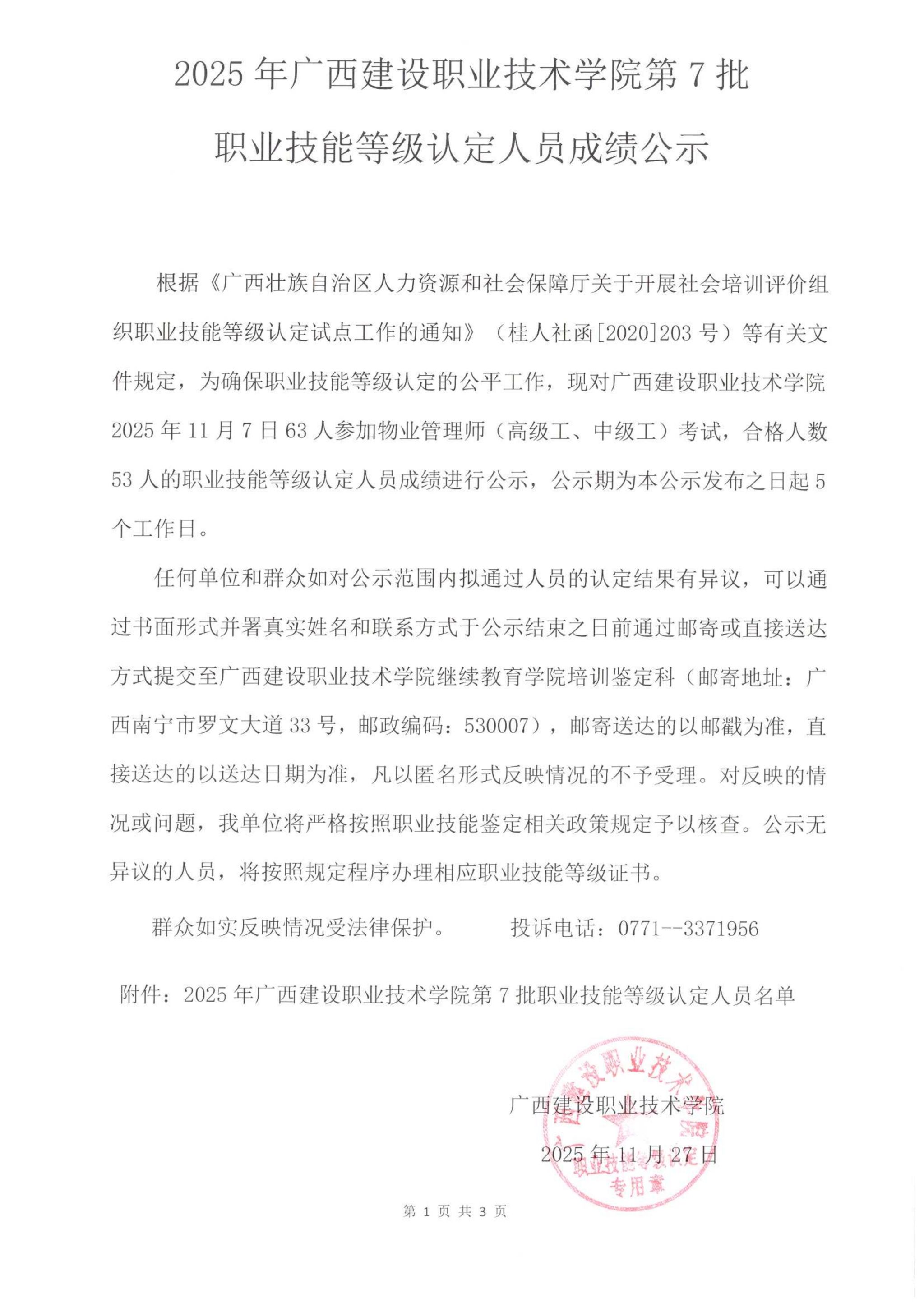 成绩公示 当前位置: 首页 >> 成绩公示 >> 正文 2025年完美网页版第7批职业技能等级认定人员成绩公示 发布日期:2025-11-27 点击: 附件【2025年完美网页版第7批职业技能等级认定人员成绩公示.pdf】已下载次