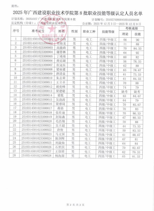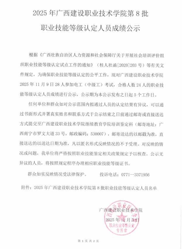成绩公示 当前位置: 首页 >> 成绩公示 >> 正文 2025年完美网页版第8批职业技能等级认定人员成绩公示 发布日期:2025-12-03 点击: 附件【2025年完美网页版第8批职业技能等级认定人员成绩公示.pdf】已下载次