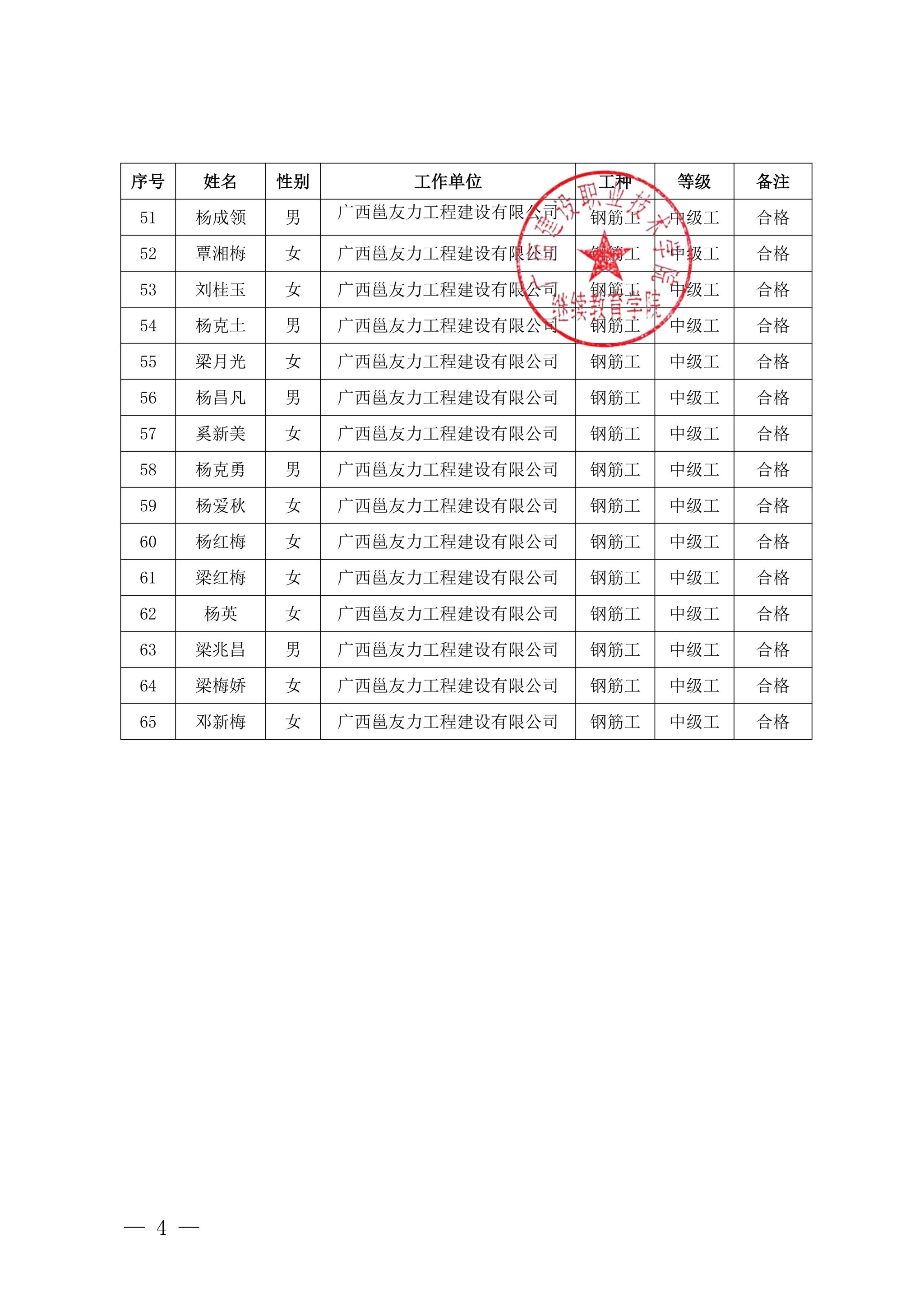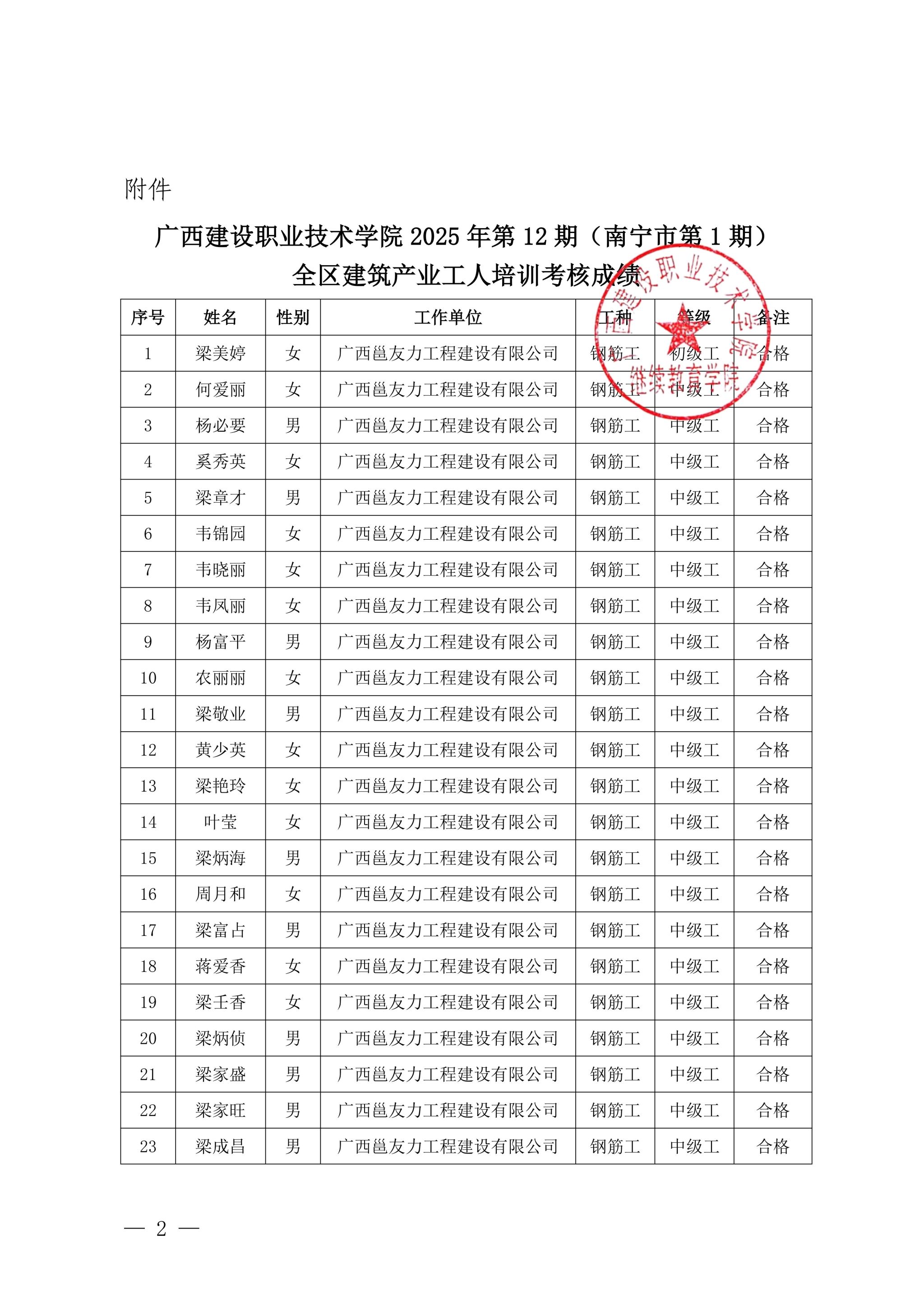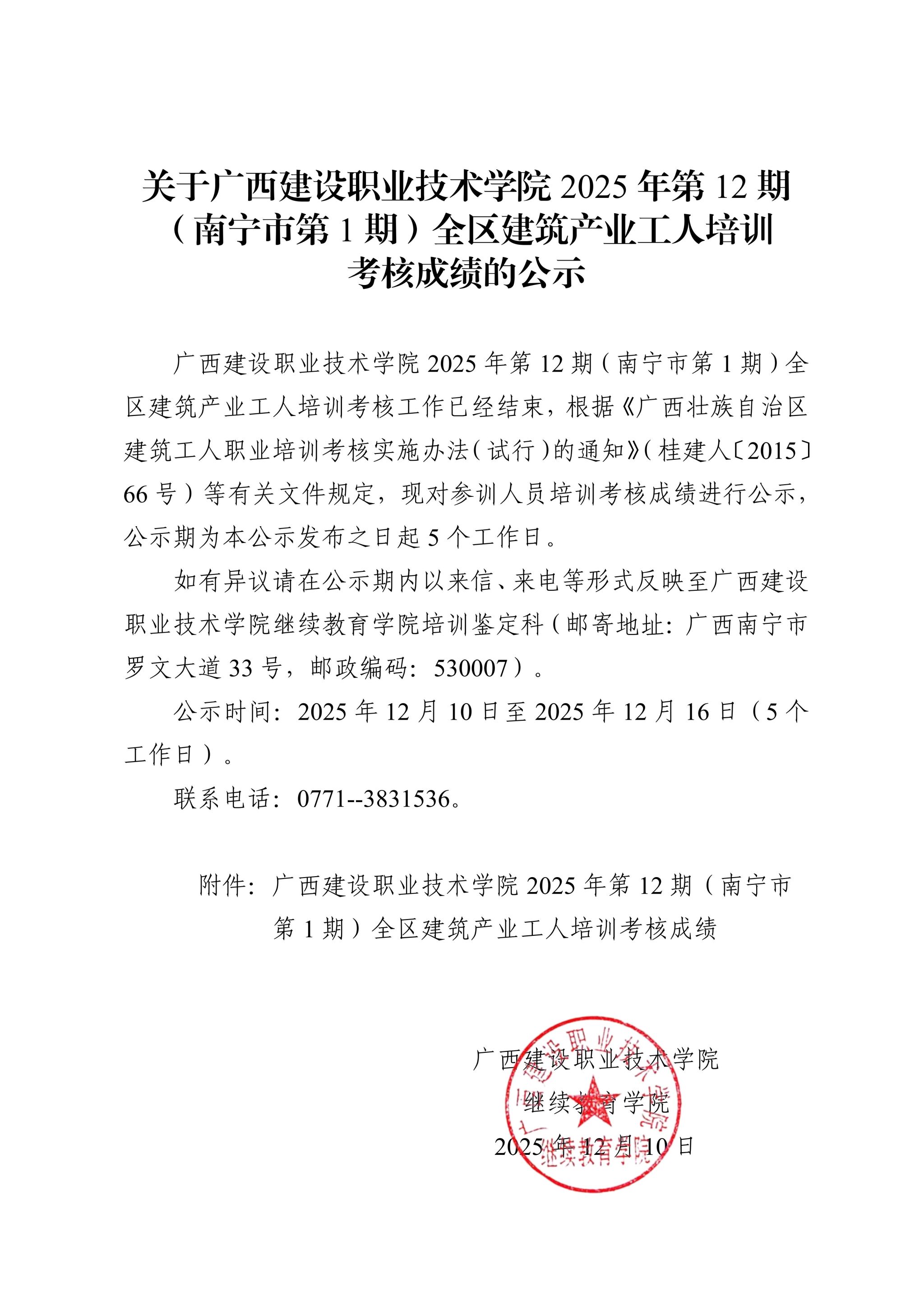 关于完美网页版2025年第12期(南宁市第1期)全区建筑产业工人培训考核成绩的公示