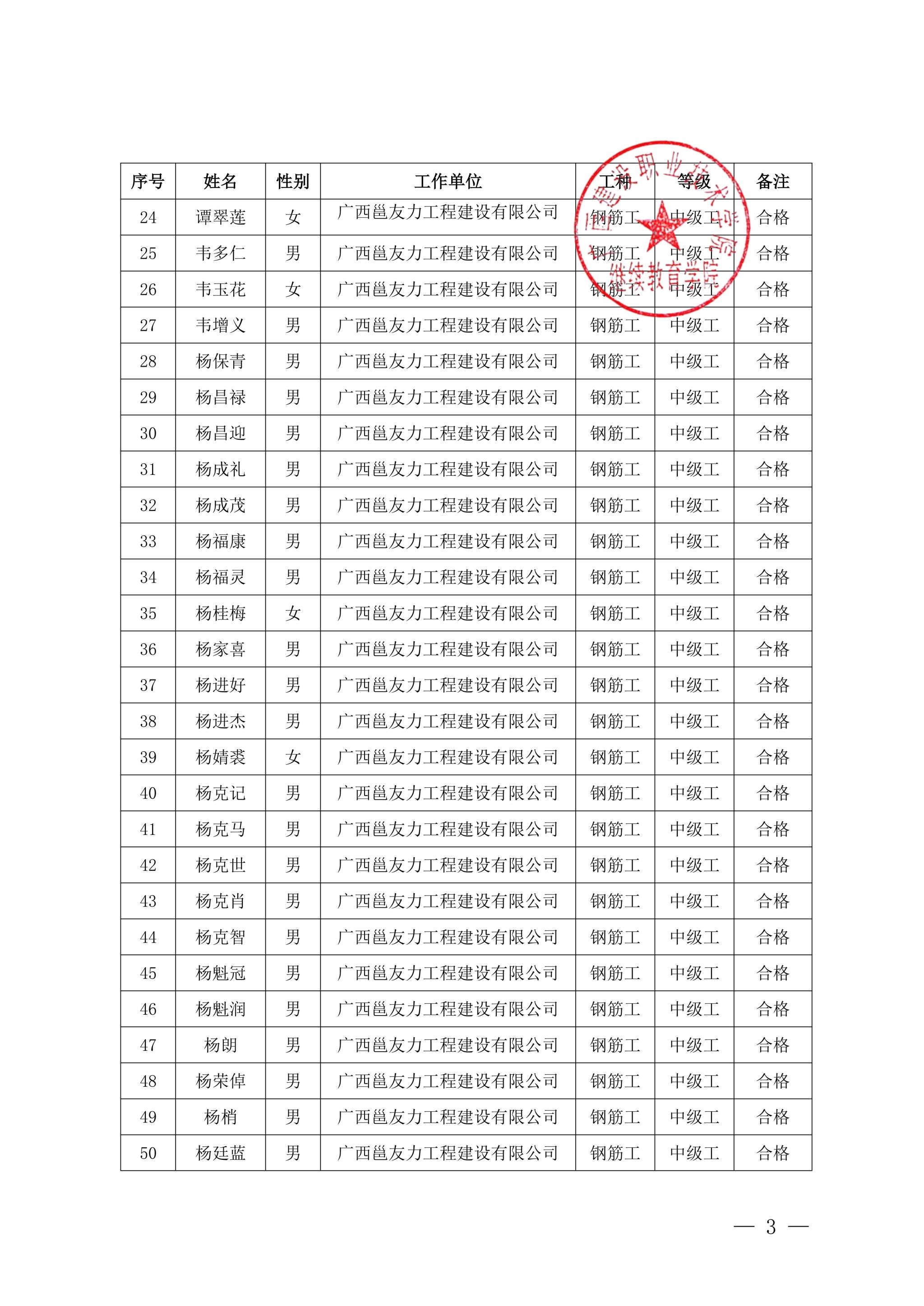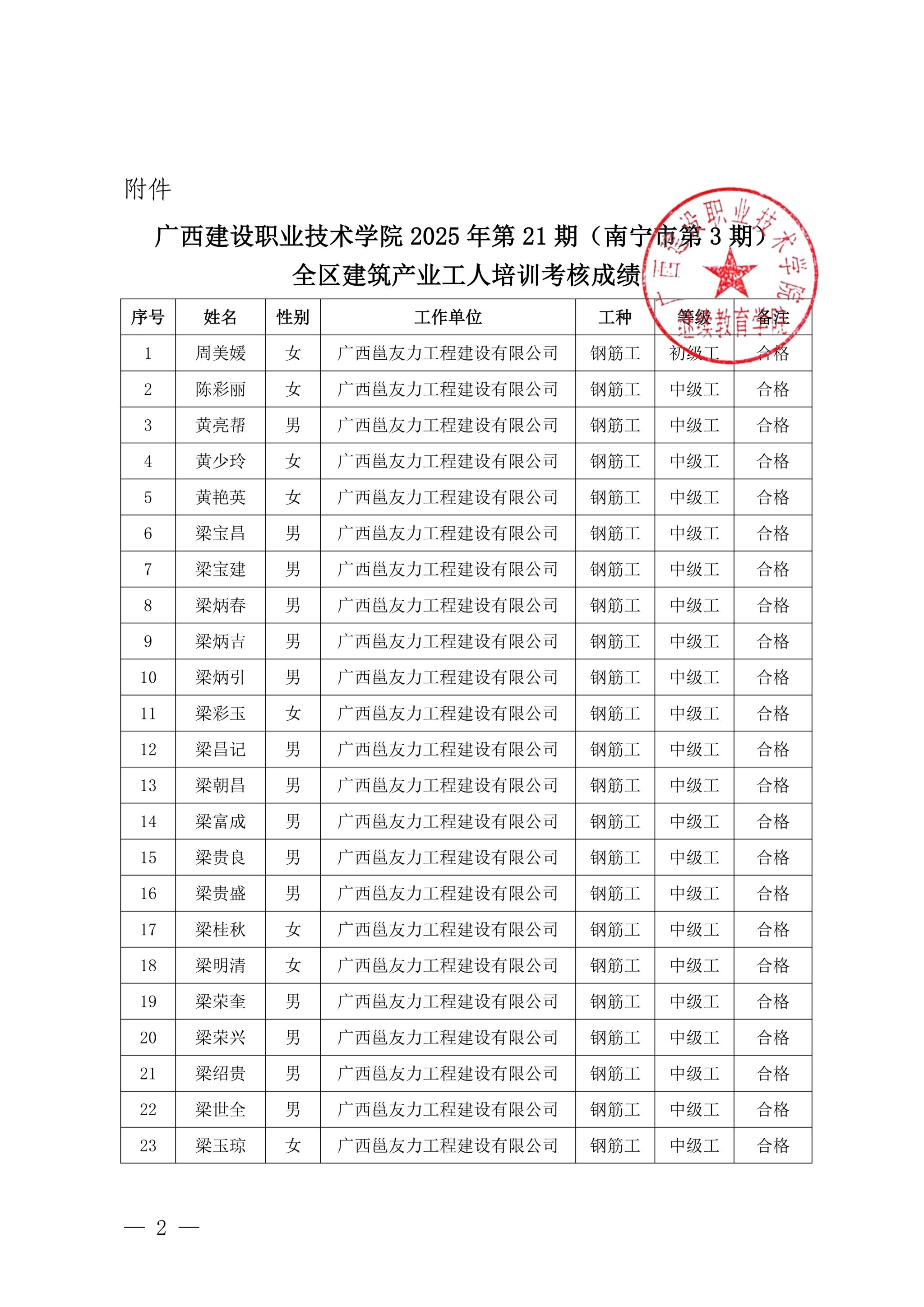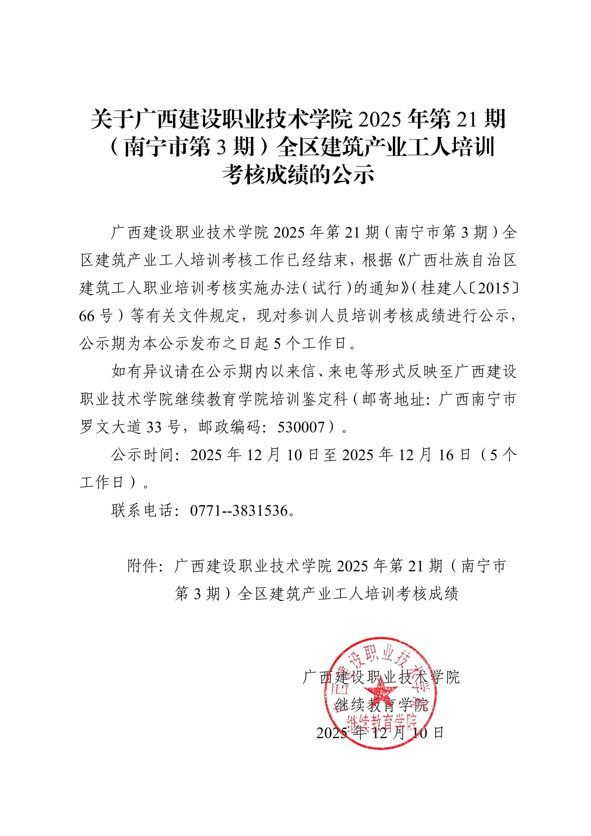 关于完美网页版2025年第21期(南宁市第3期)全区建筑产业工人培训考核成绩的公示