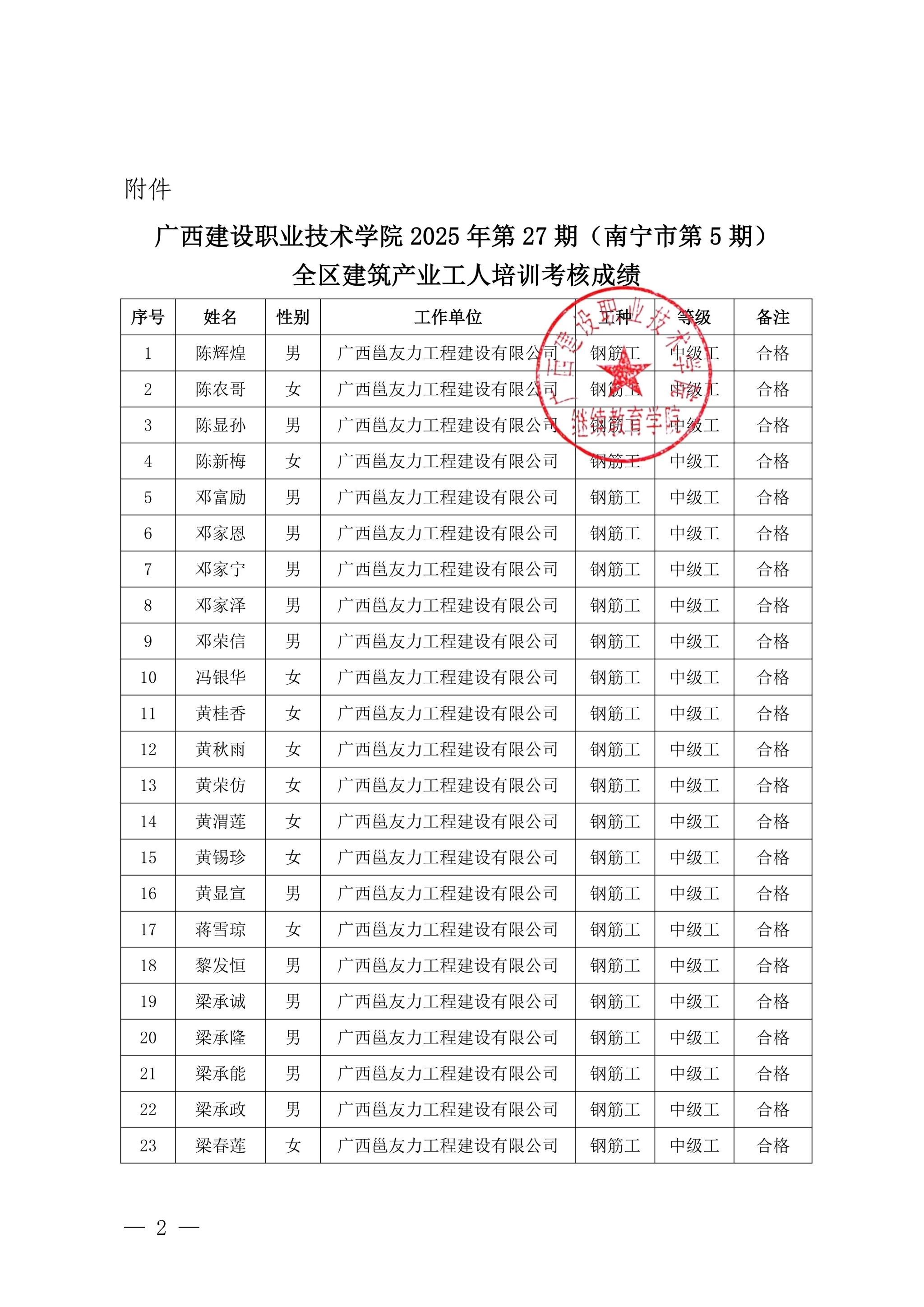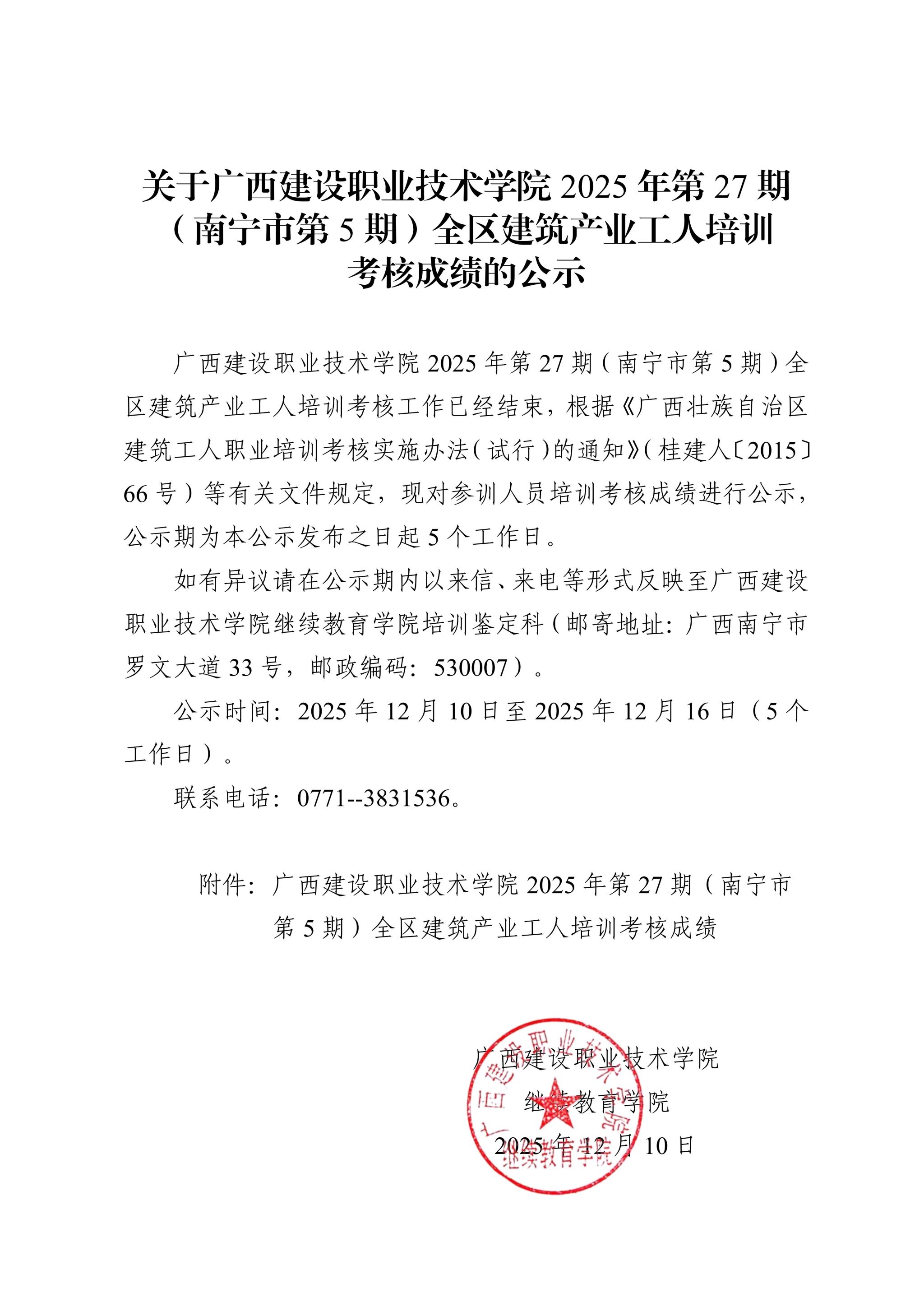 关于完美网页版2025年第27期(南宁市第5期)全区建筑产业工人培训考核成绩的公示