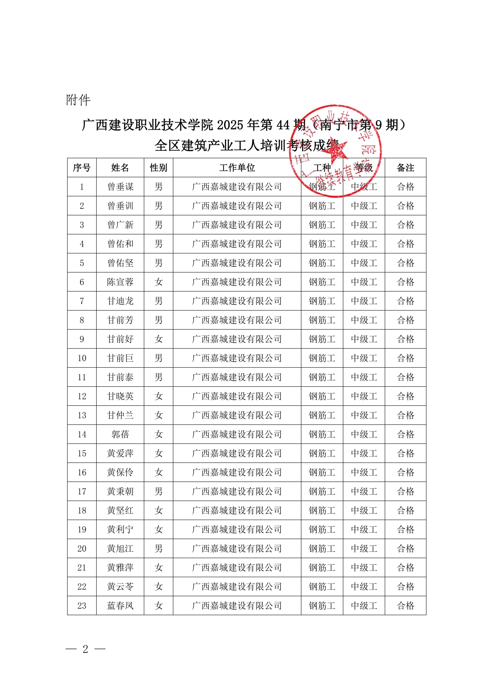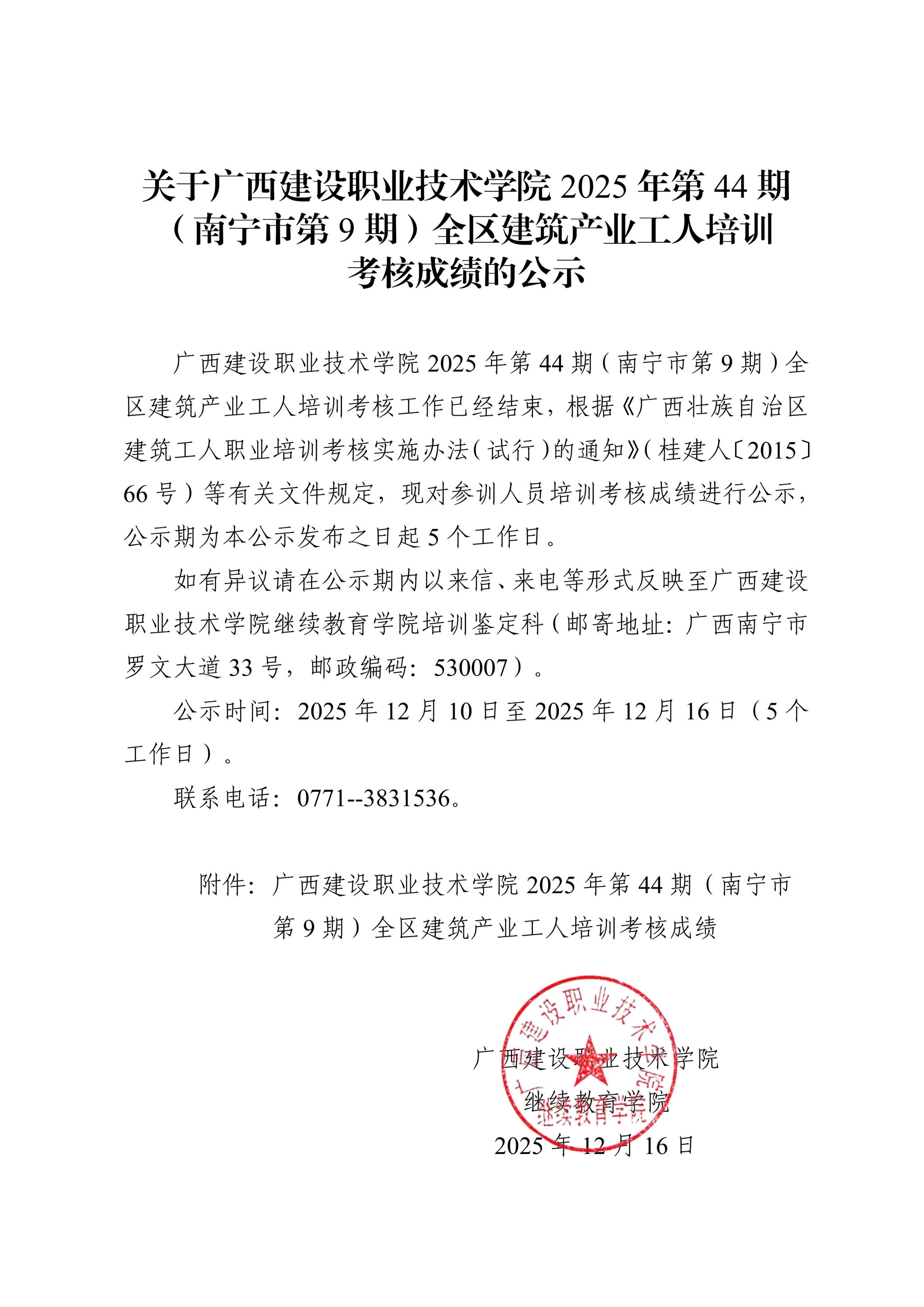 关于完美网页版2025年第44期(南宁市第9期)全区建筑产业工人培训考核成绩的公示
