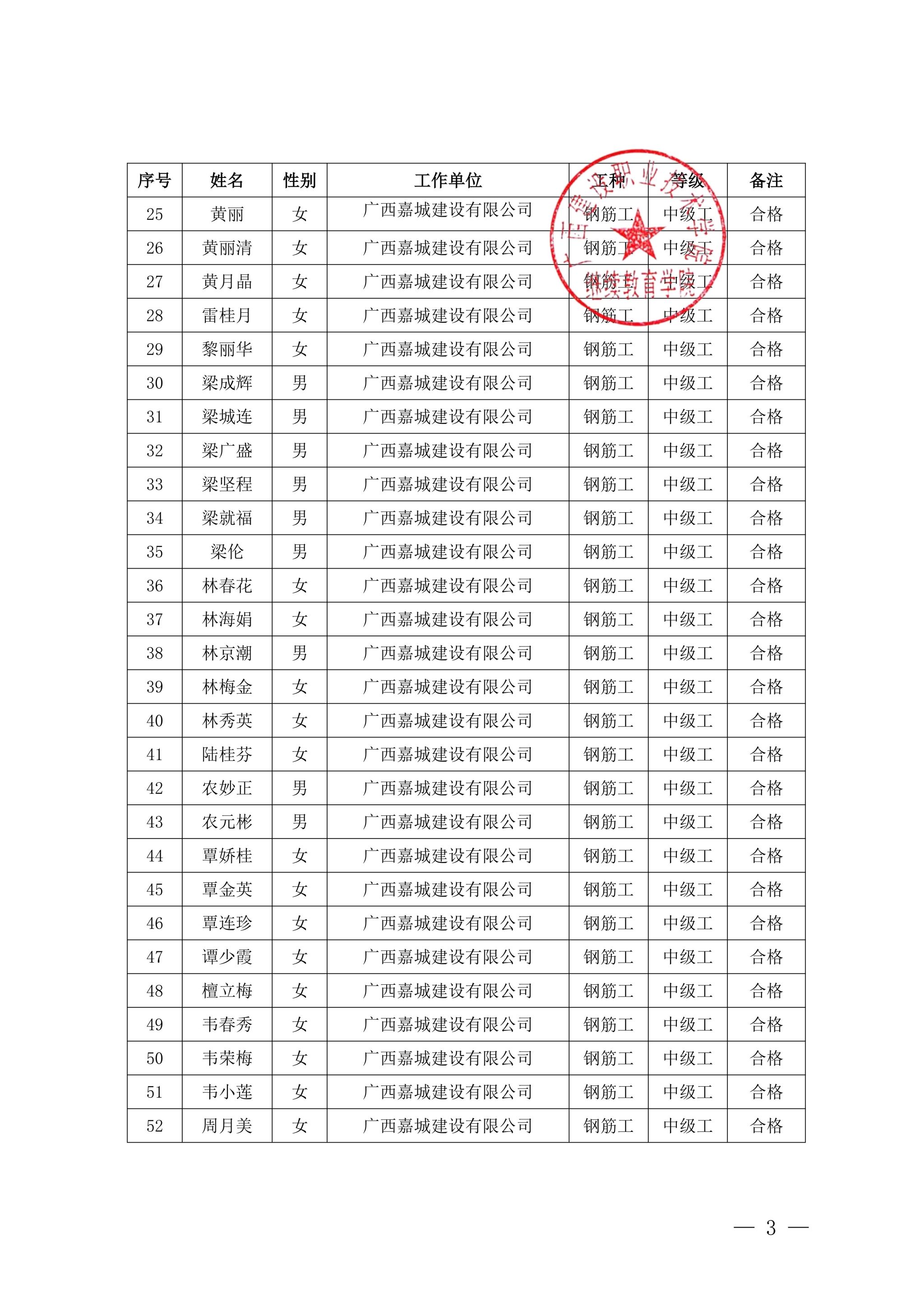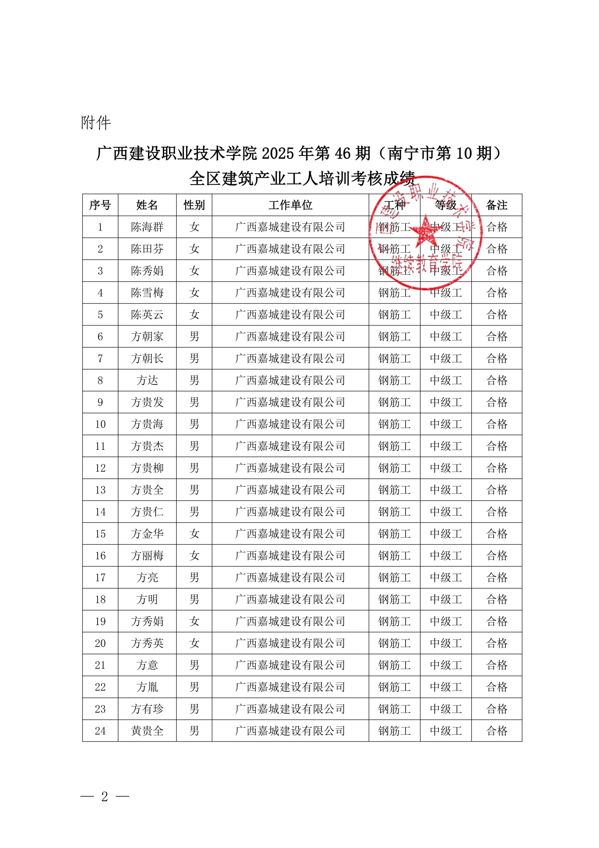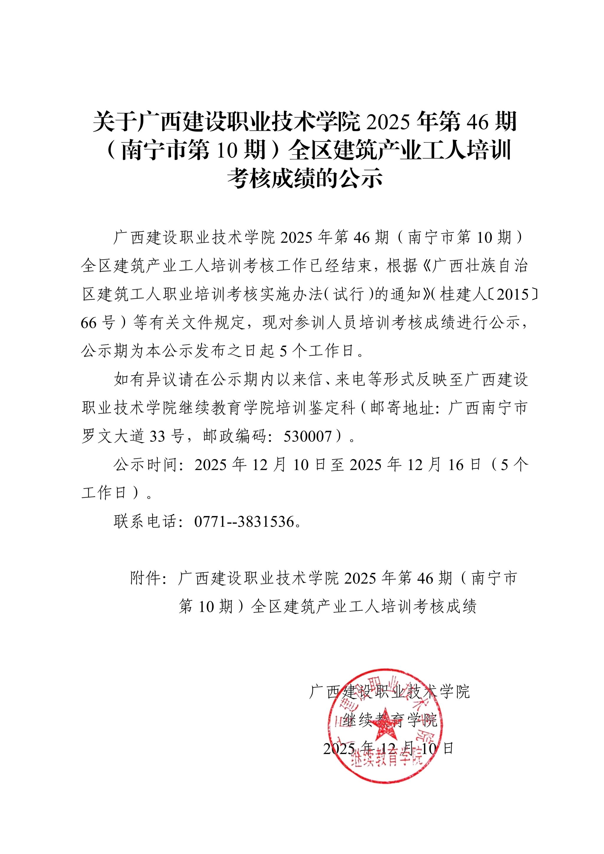 关于完美网页版2025年第46期(南宁市第10期)全区建筑产业工人培训考核成绩的公示