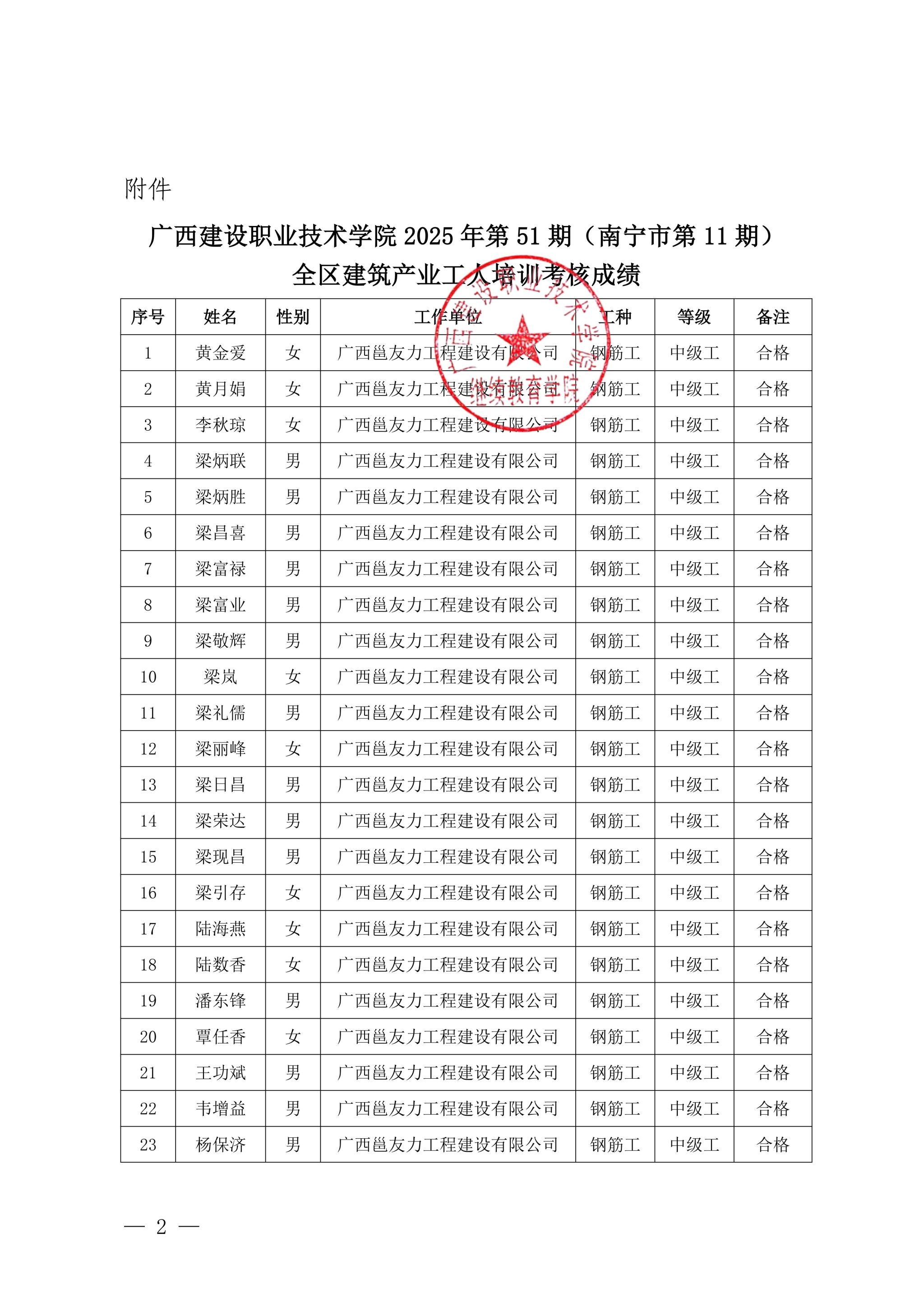 关于完美网页版2025年第51期(南宁市第11期)全区建筑产业工人培训考核成绩的公示