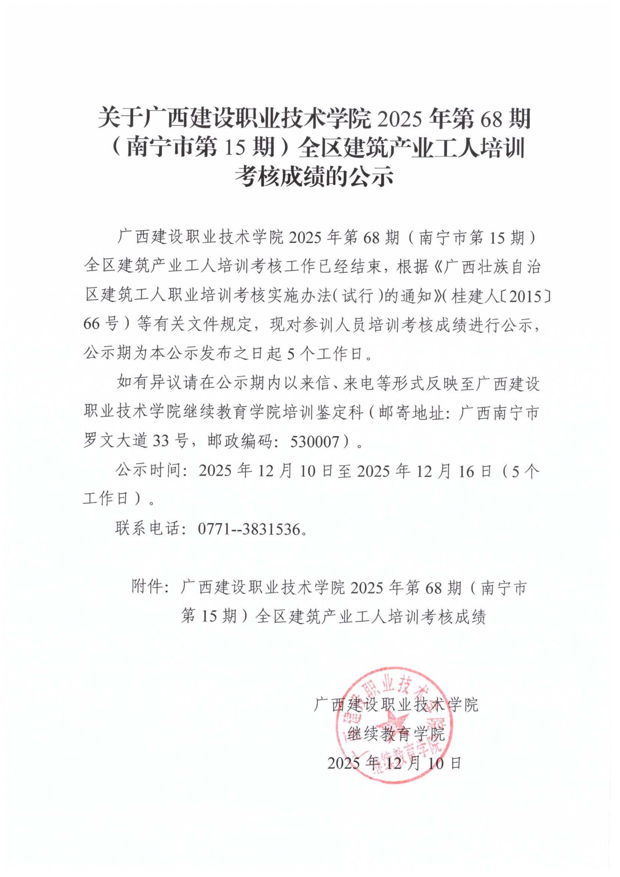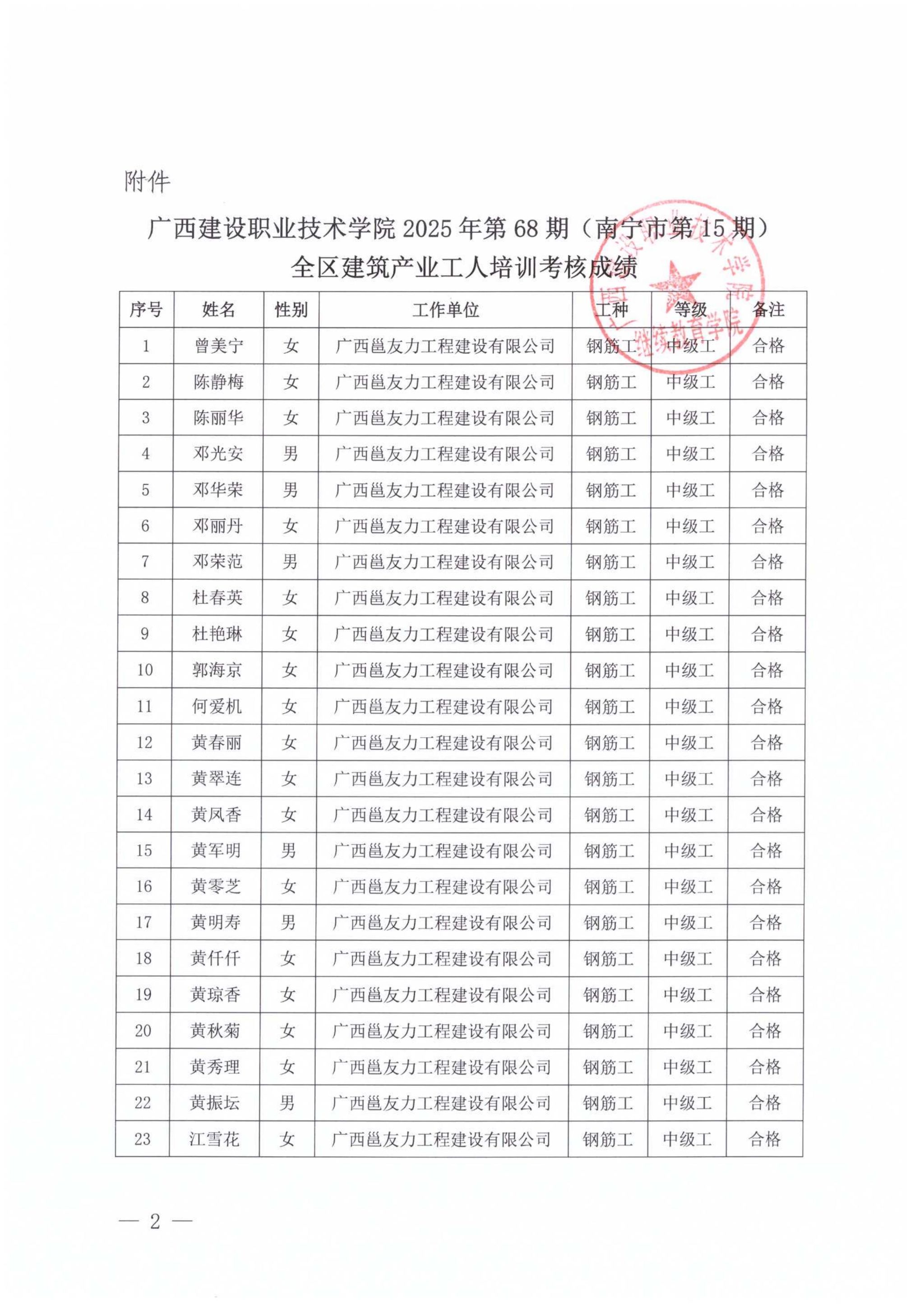 关于完美网页版2025年第68期(南宁市第15期)全区建筑产业工人培训考核成绩的公示