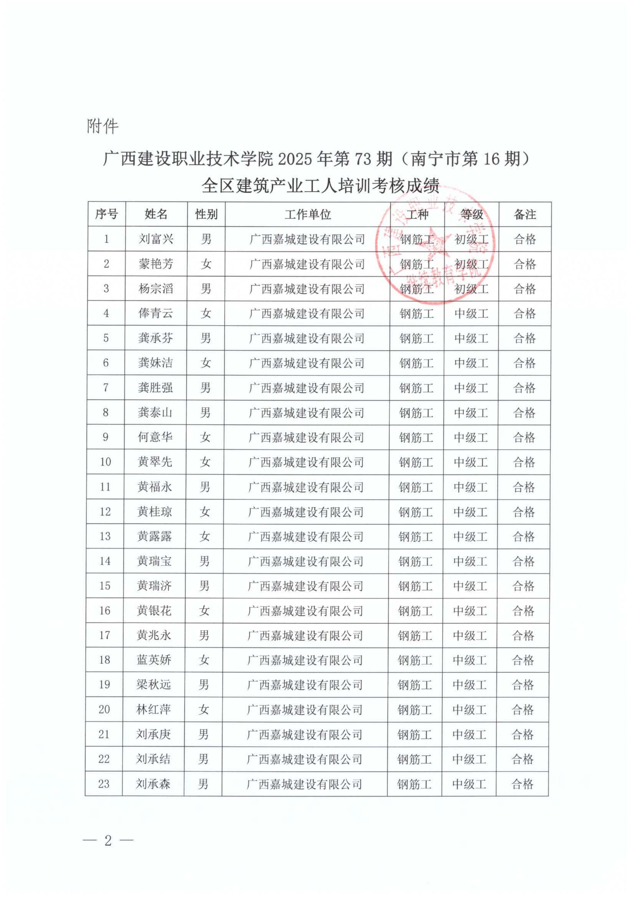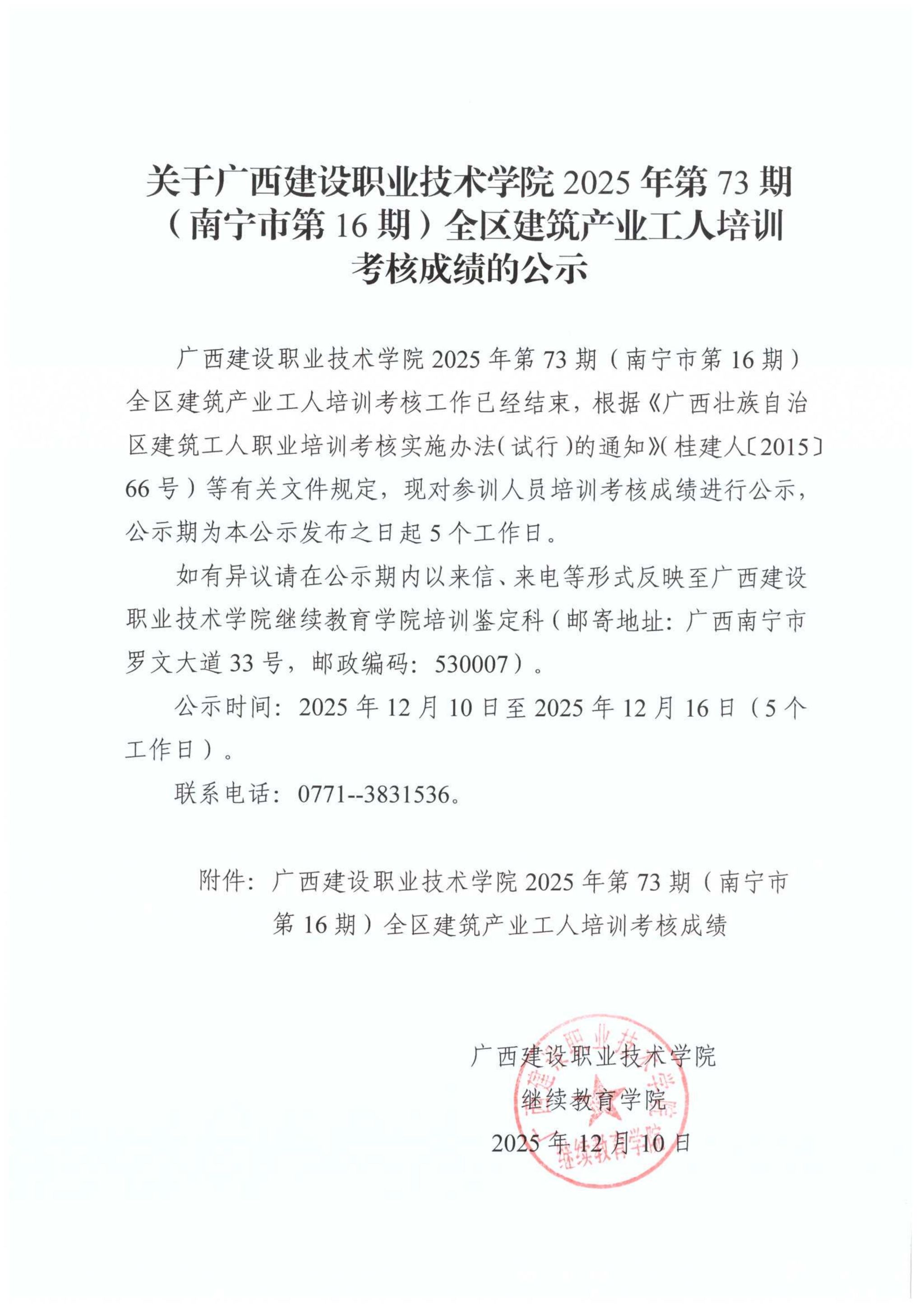 关于完美网页版2025年第73期(南宁市第16期)全区建筑产业工人培训考核成绩的公示