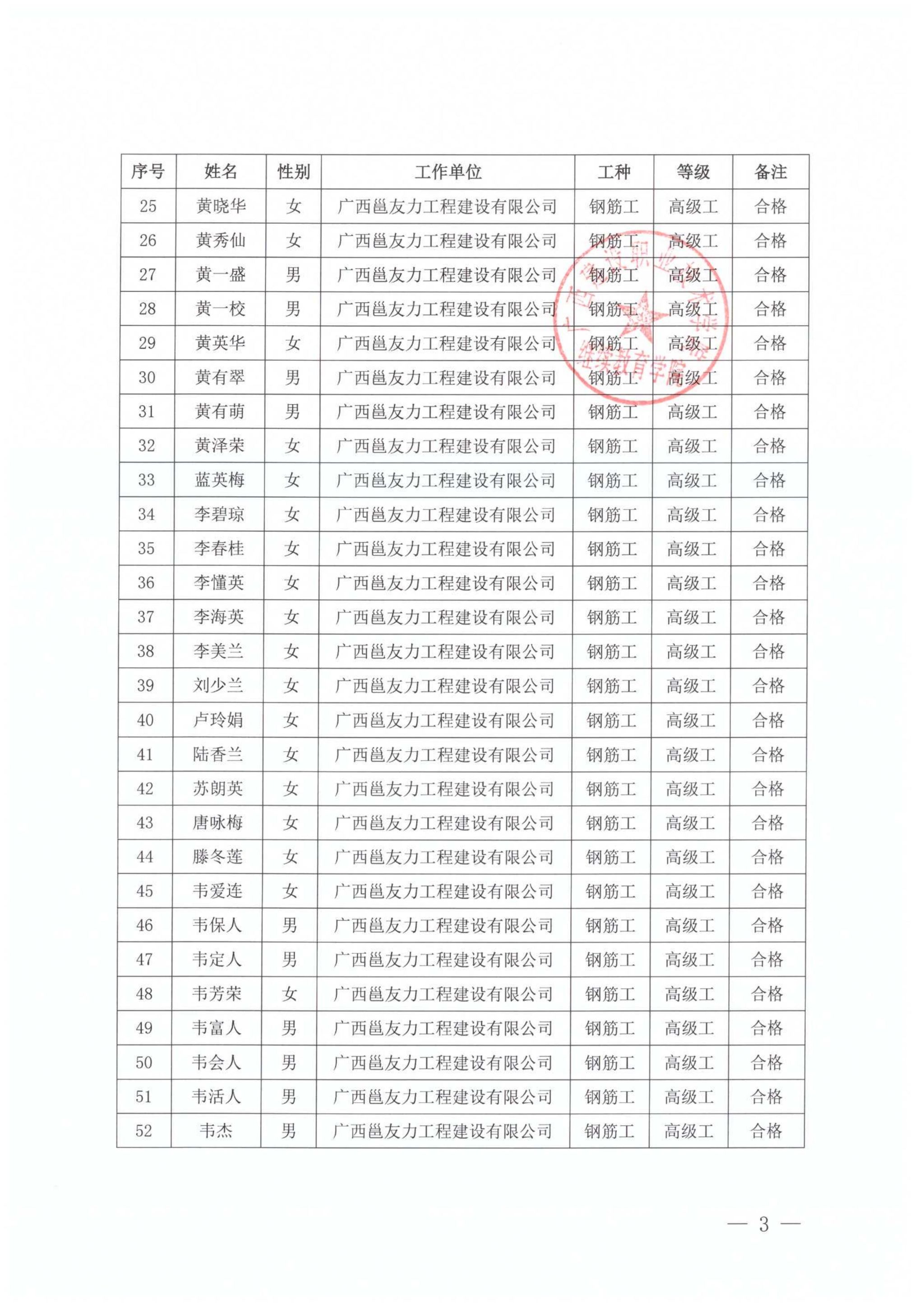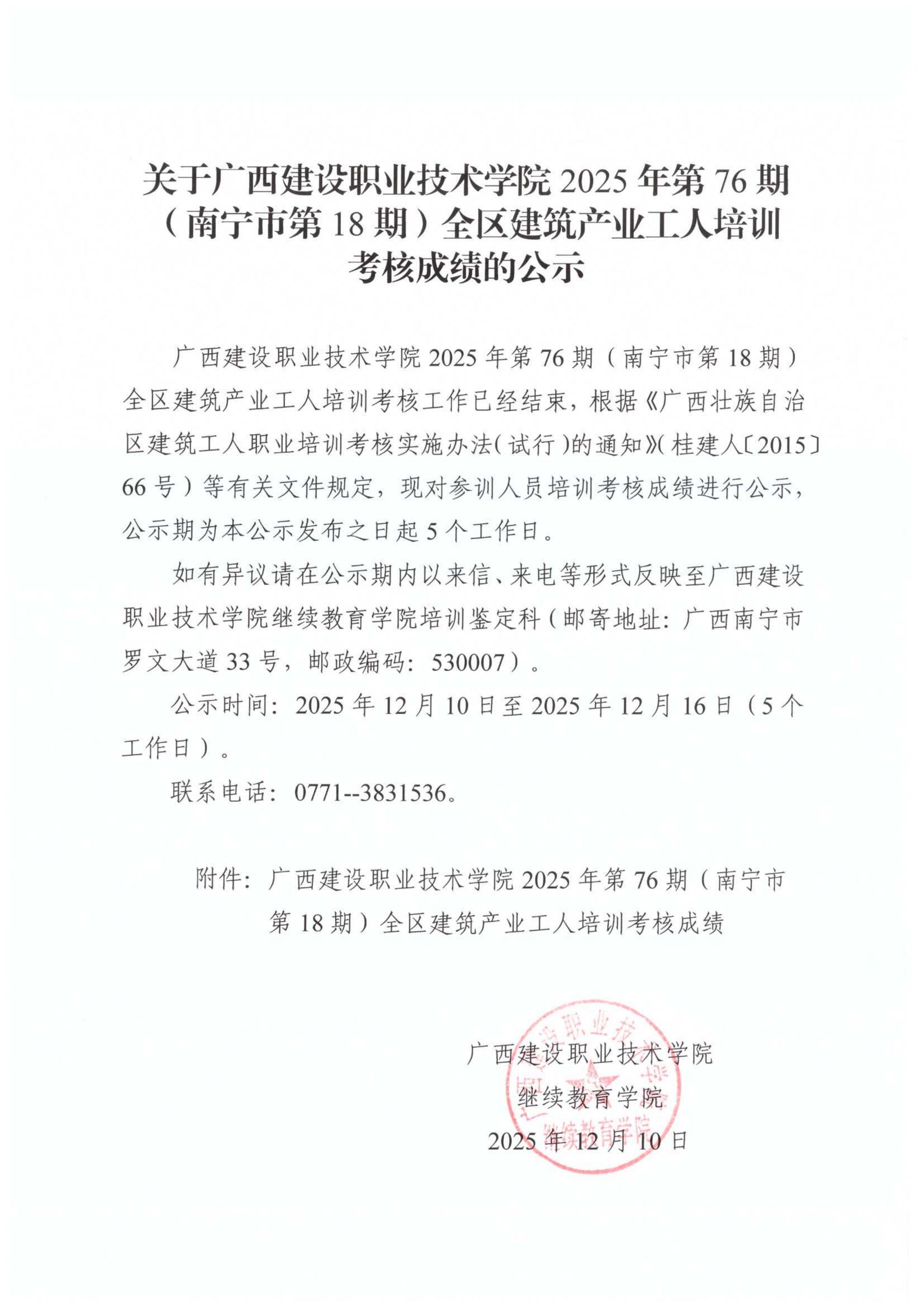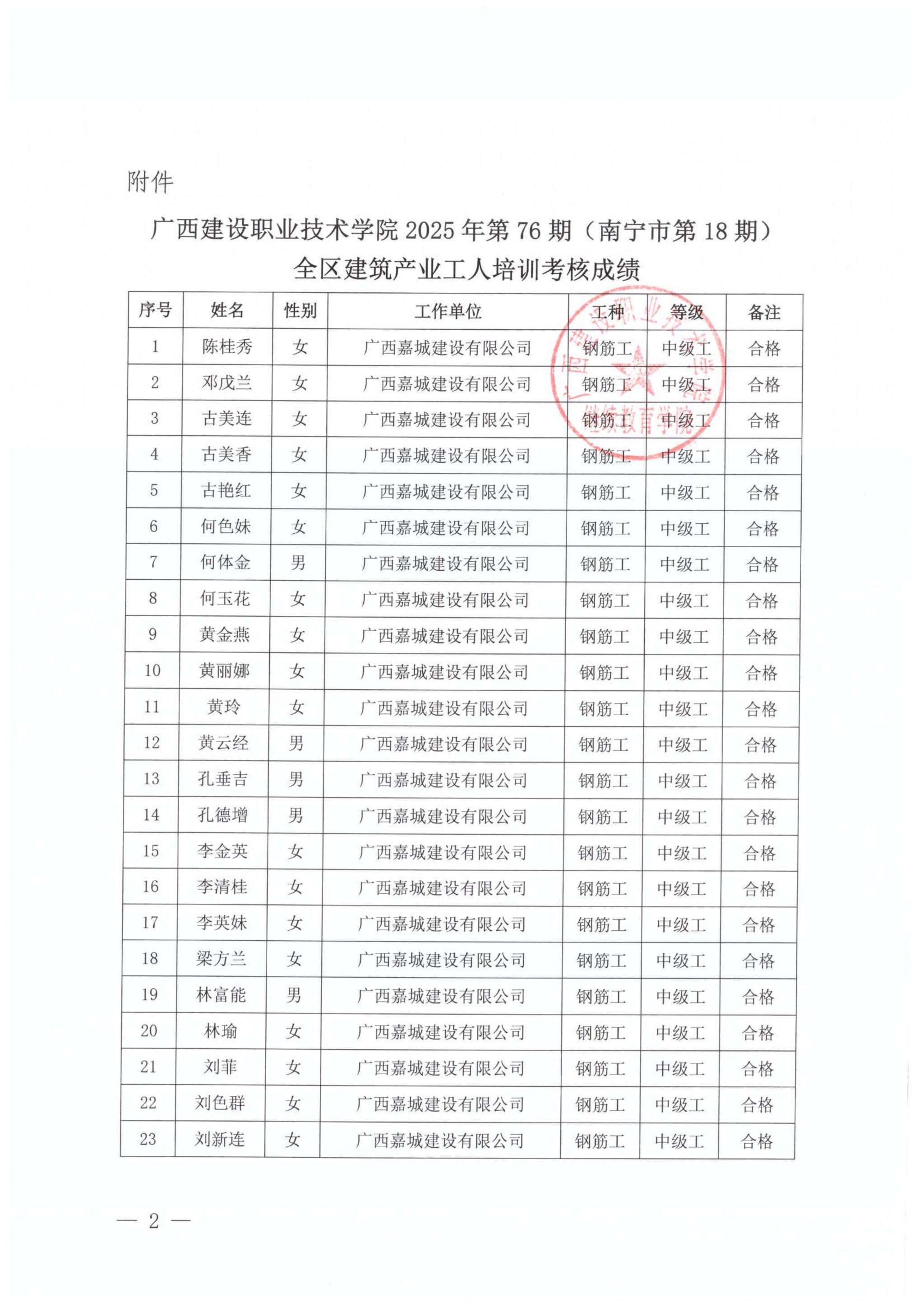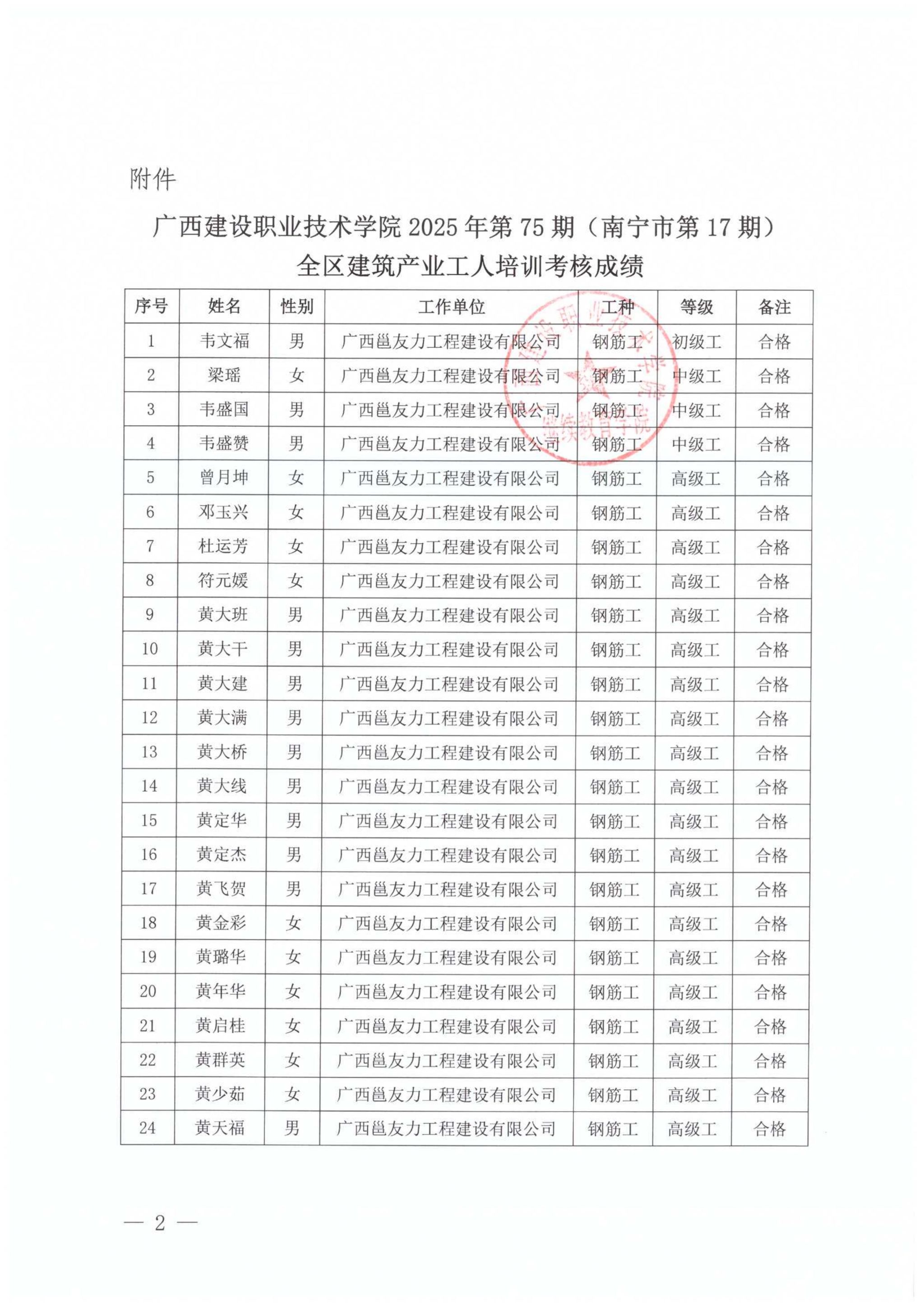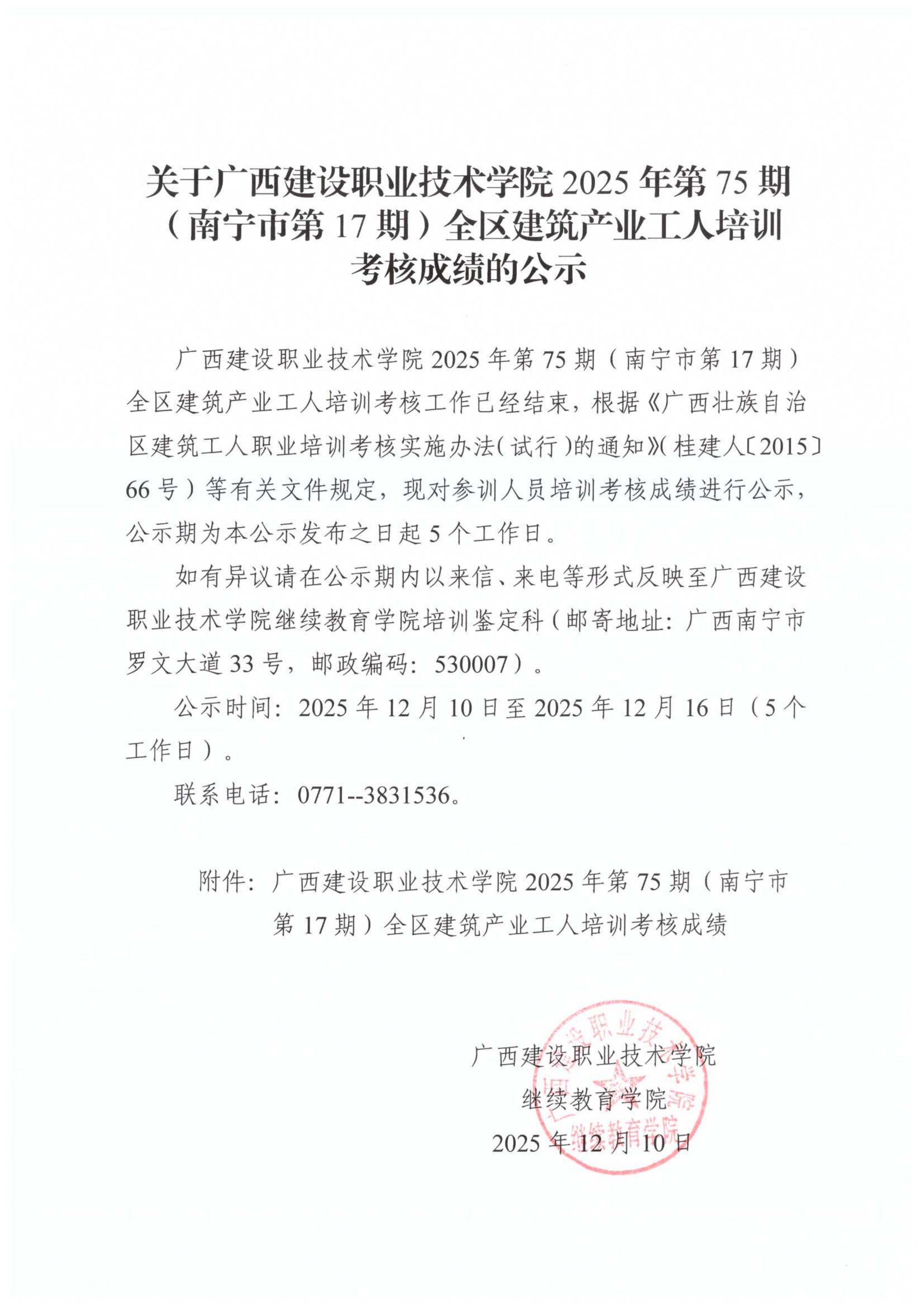 关于完美网页版2025年第75期(南宁市第17期)全区建筑产业工人培训考核成绩的公示